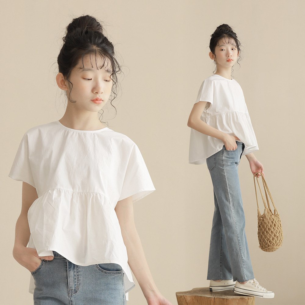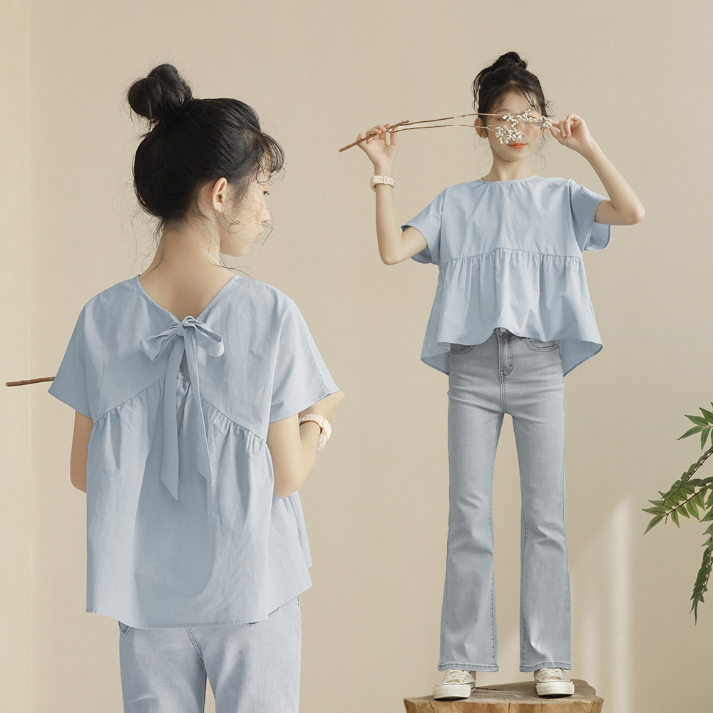 Girls' Doll Shirt Summer Middle-aged Children's Design Sense Niche Blue Sweet Top Family Dress Cotton Cross-border ins Hair