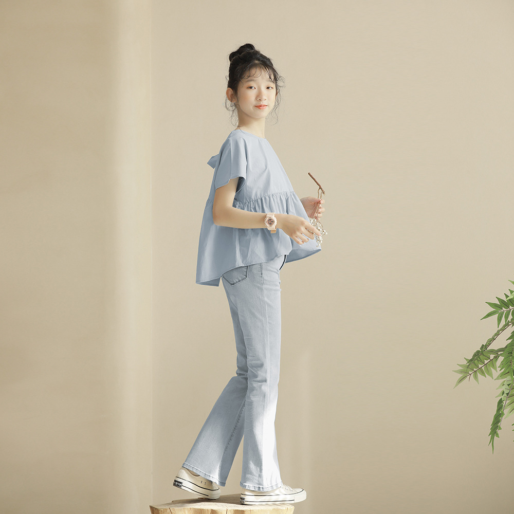 Girls’ Doll Shirt Summer Middle-aged Children’s Design Sense Niche Blue Sweet Top Family Dress Cotton Cross-border ins Hair