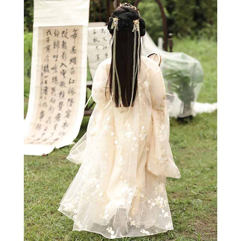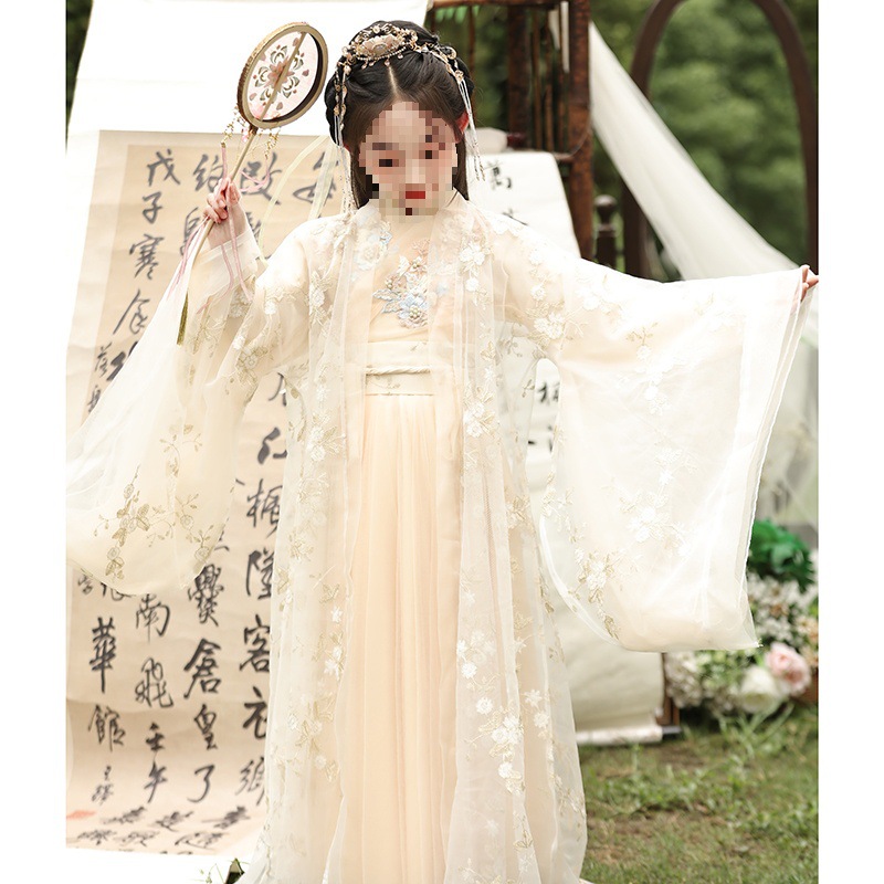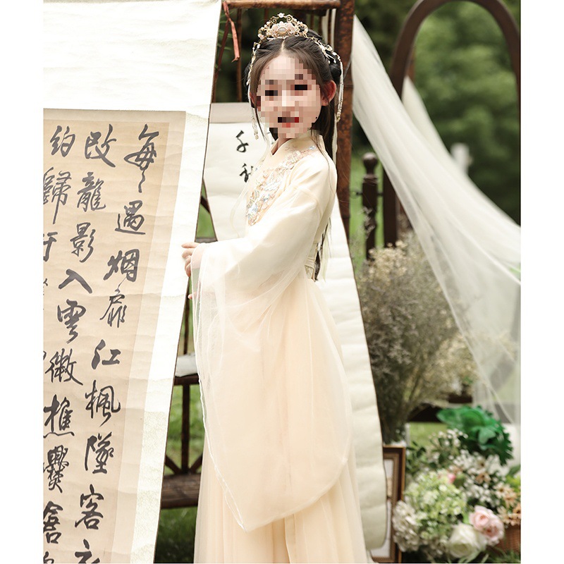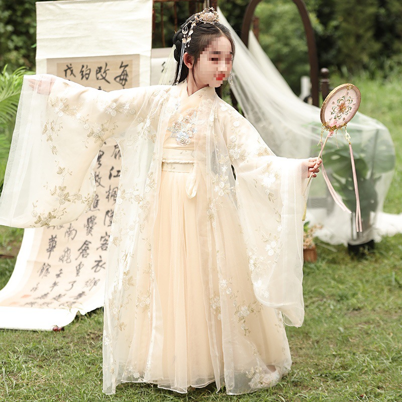Girl’s Hanfu Spring and Autumn Fairy elegant ancient costume chinese style children’s little girl champagne color Wide sleeve waist fairy Broad