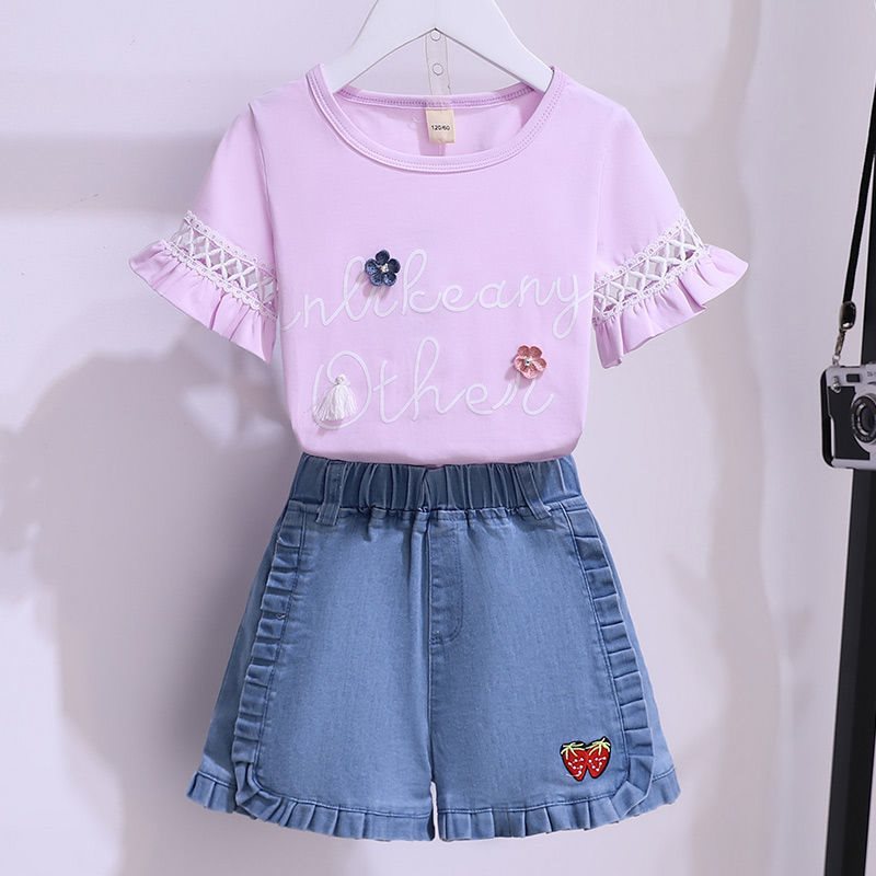 | nameOriginal | Girls' Internet Celebrity suit Summer Clothes 2022 New Western Style Children's Short-sleeved Summer Denim Shorts Two-piece Set of Fashionable Clothes |
