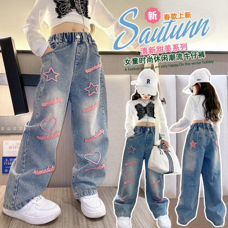 | nameOriginal | Girls Joker Jeans 2024 New Korean Style Middle and Big Children's Fashionable Popular Western Style Love Denim Wide Leg Pants Trendy |