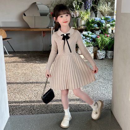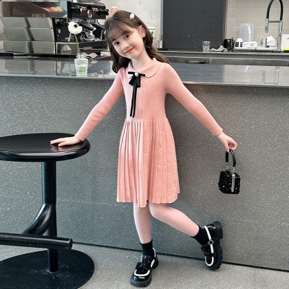Girls’ knitted dress 2024 spring Korean style new children’s cute doll collar sweater baby pleated dress