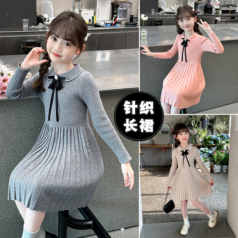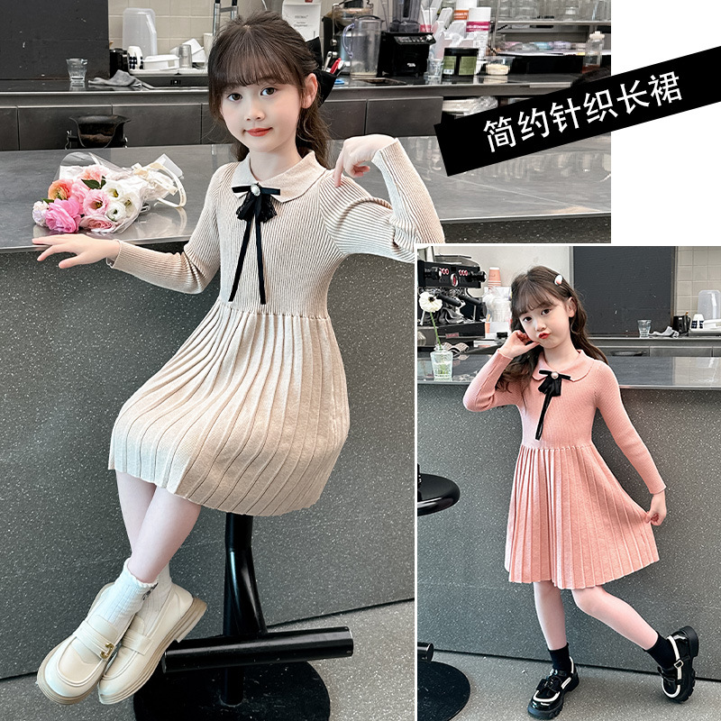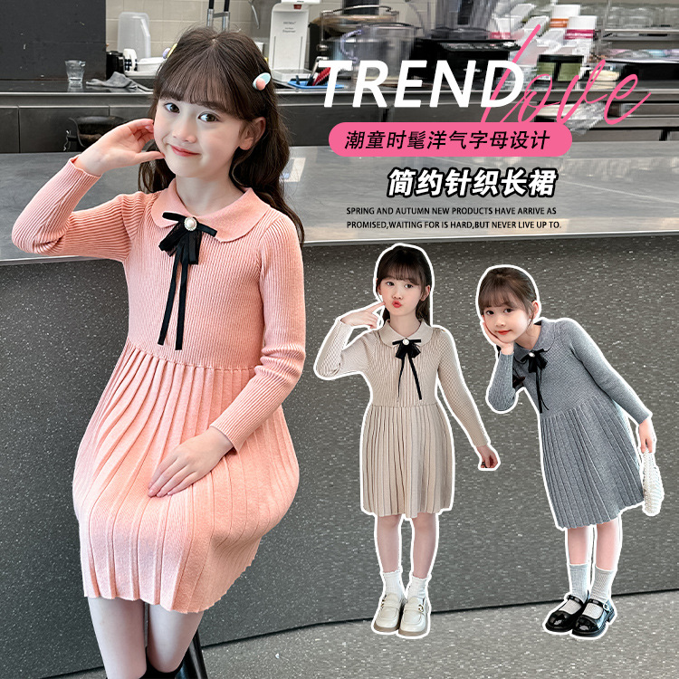 Girls' knitted dress 2024 spring Korean style new children's cute doll collar sweater baby pleated dress