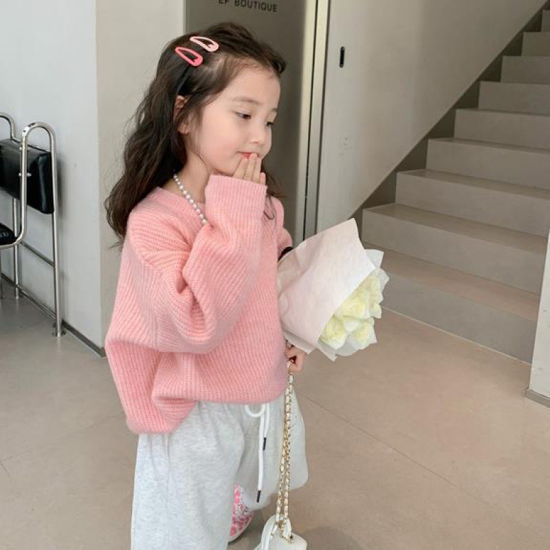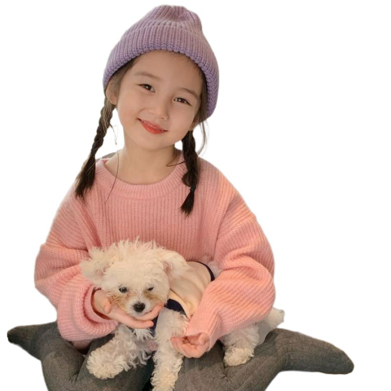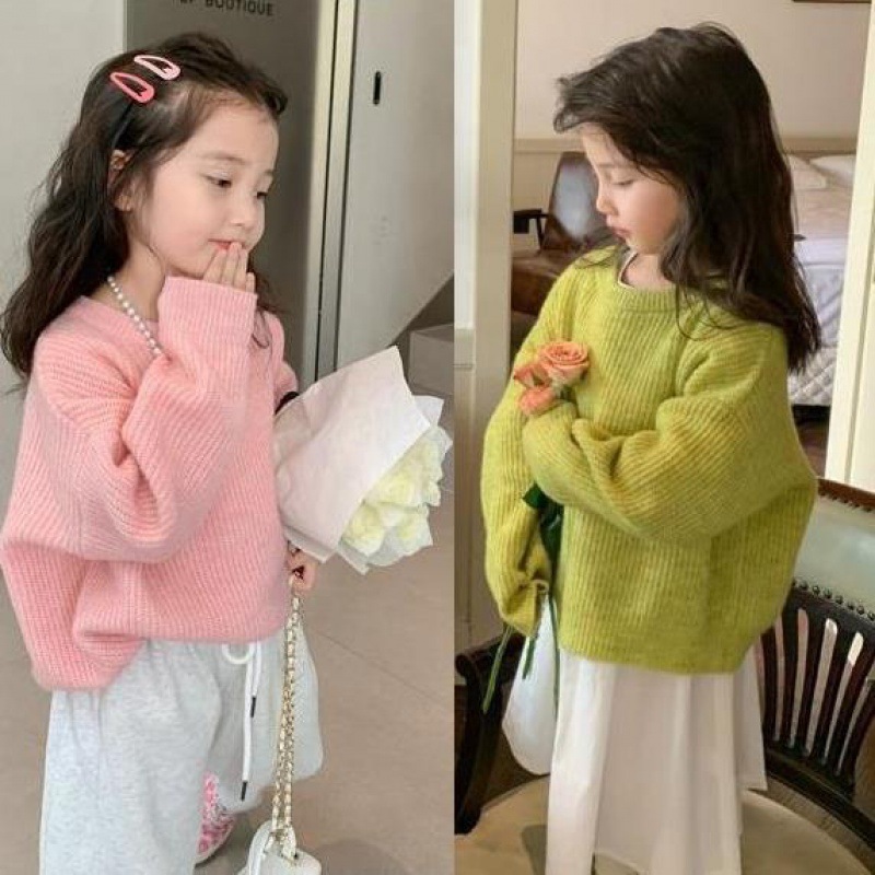 Girls’ Korean-style knitted sweater 2024 Autumn New style children’s western style solid color round neck versatile casual top fashion