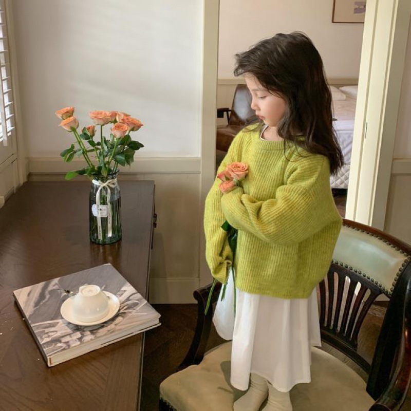 Girls' Korean-style knitted sweater 2024 Autumn New style children's western style solid color round neck versatile casual top fashion