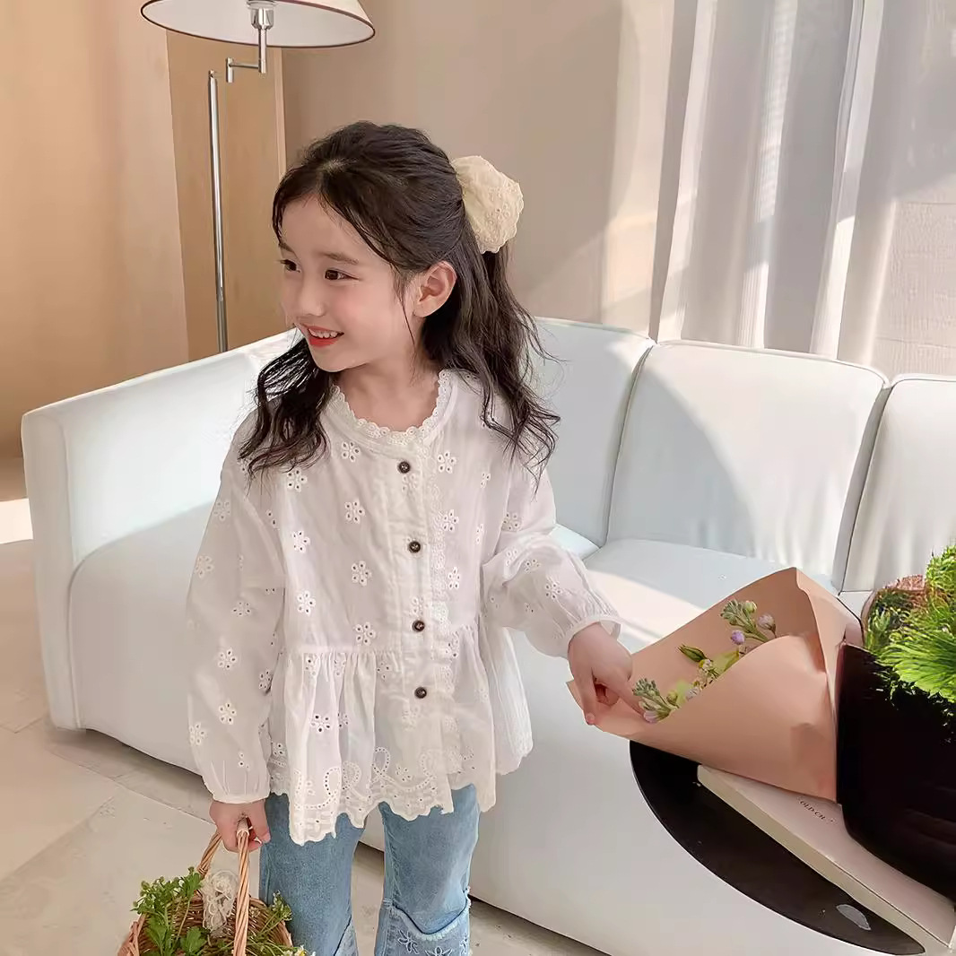 | nameOriginal | Girls' Lace Shirt 2024 New Baby Spring Cotton Princess Style Top Children's Doll Shirt White Shirt |