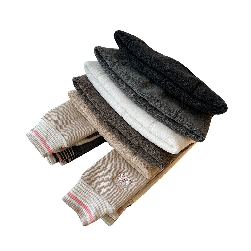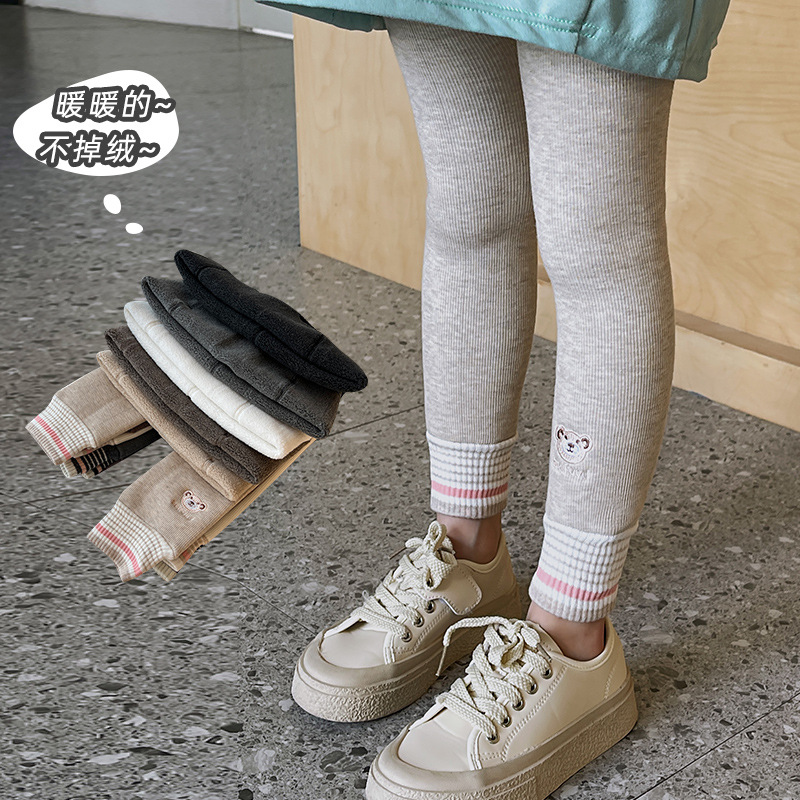 | nameOriginal | Girls' leggings fleece-lined thickened autumn and winter warm one-piece pants cotton vertical stripes children's high waist cartoon bear trousers |