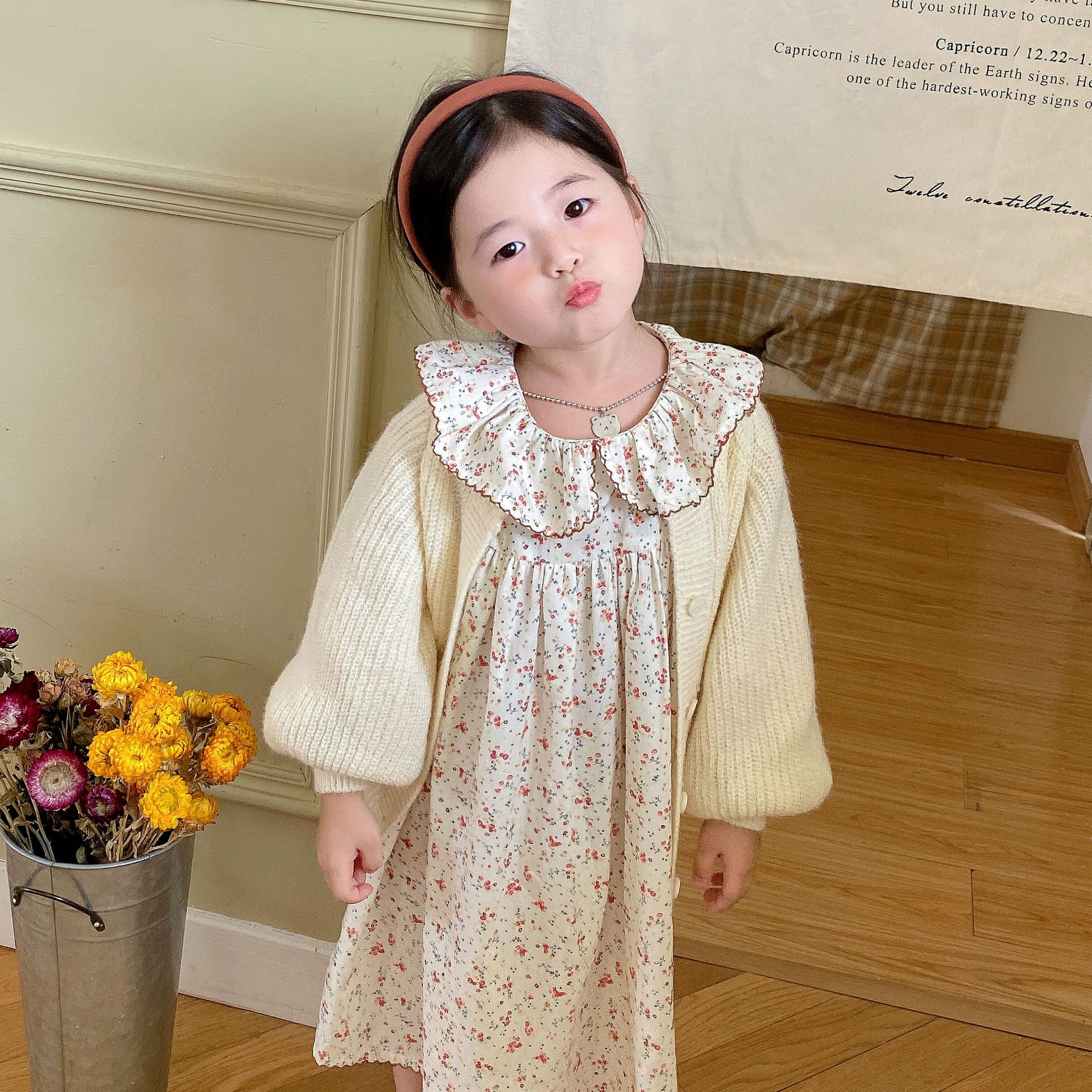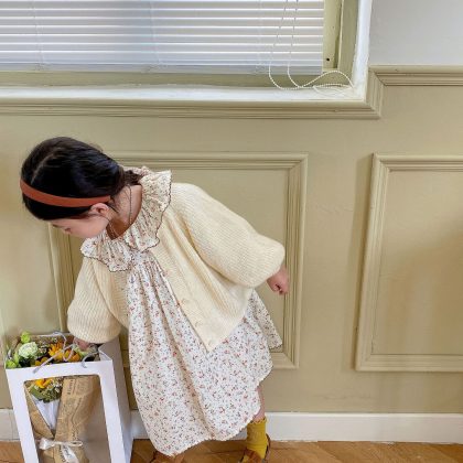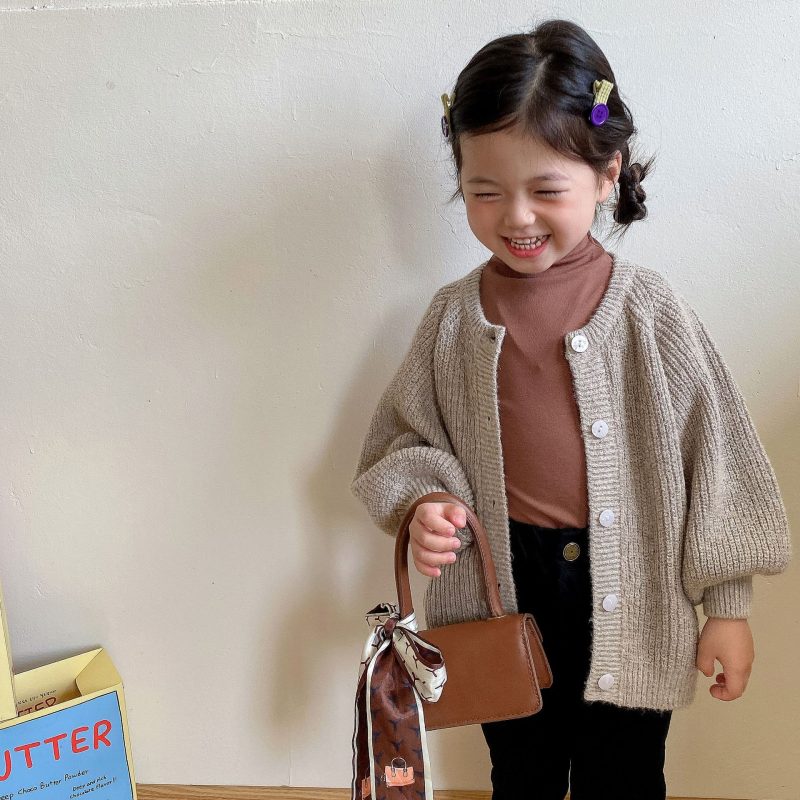 Girls’ Mohair Sweater 2023 Autumn New Baby Korean Style Foreign Style Long Sleeve Coat Puff Sleeve Knitted Cardigan