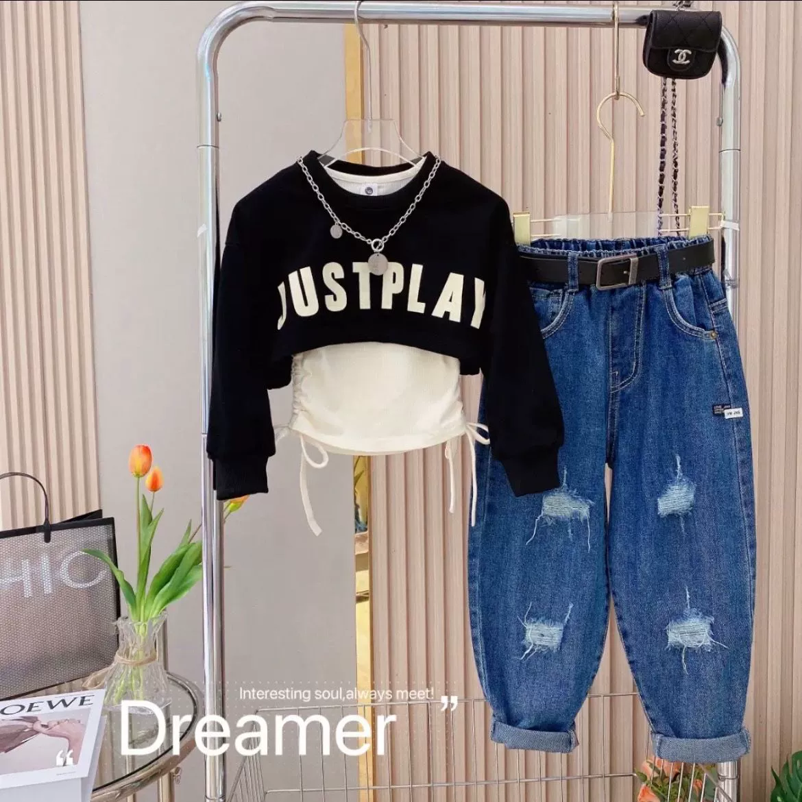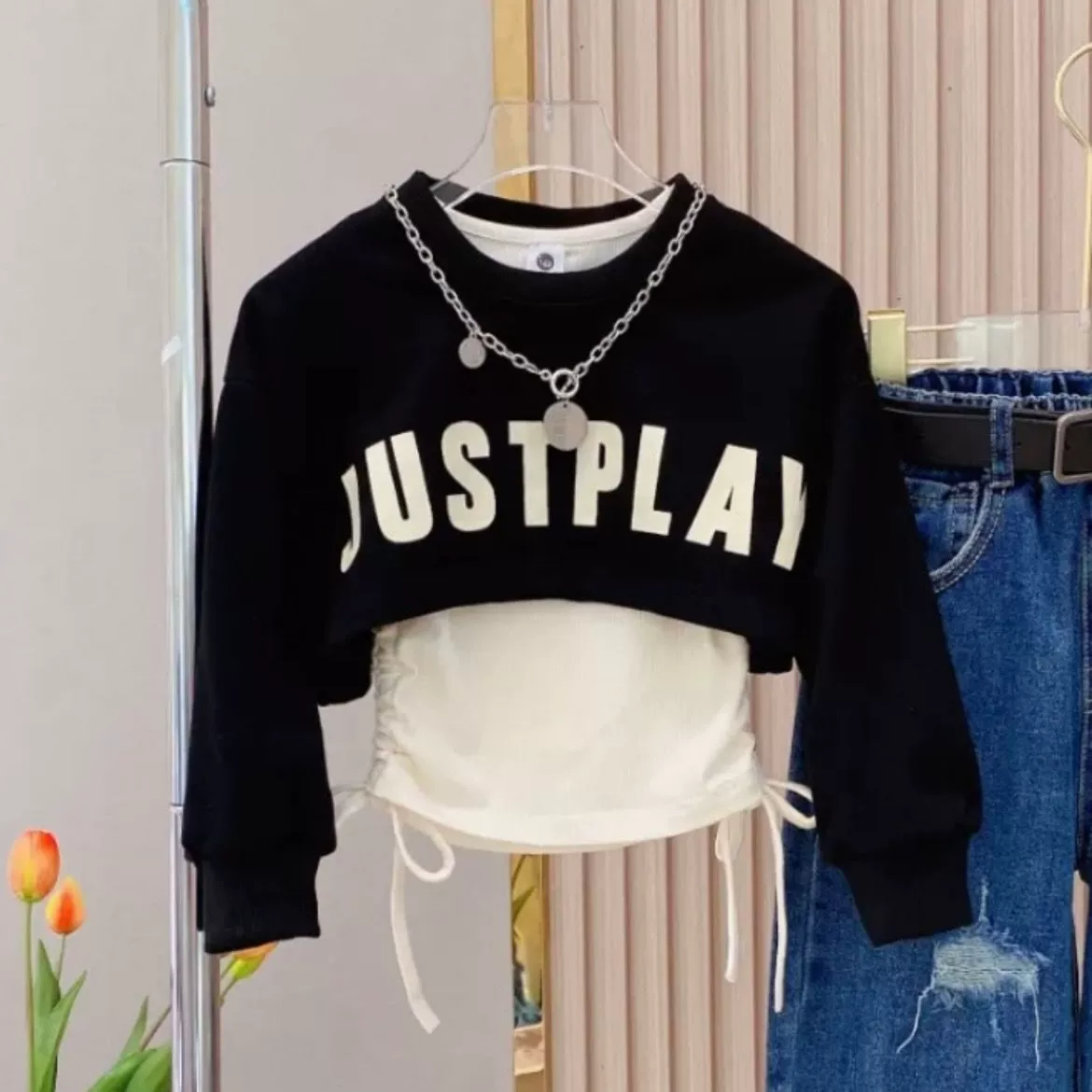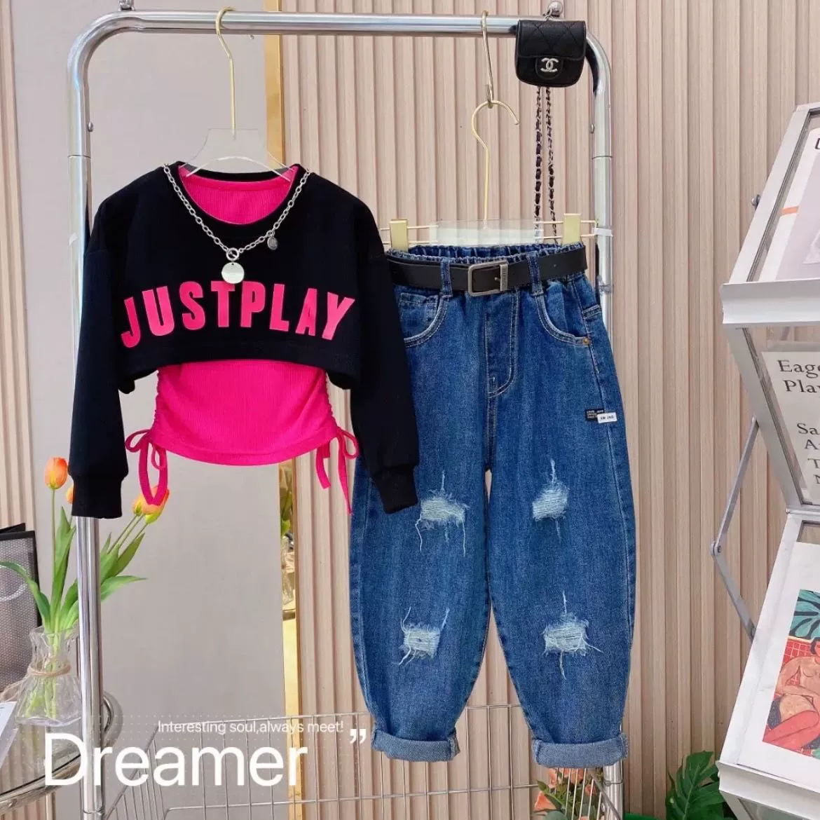 | nameOriginal | Girls' new autumn trendy street-style letter printed long-sleeved sweatshirt with inner suspender two-piece set dad cow Korean style |