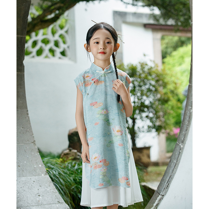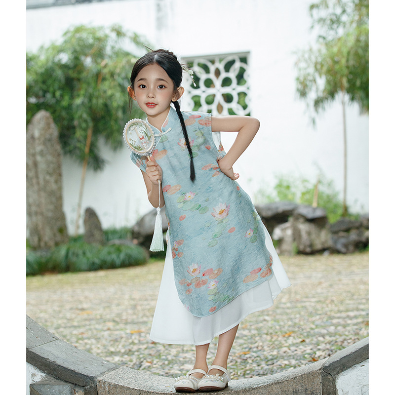 Girls’ New Chinese Style dress Green Ao Dai Cheongsam Summer 2024 New Chinese Style Antique Hanfu for Little Girls