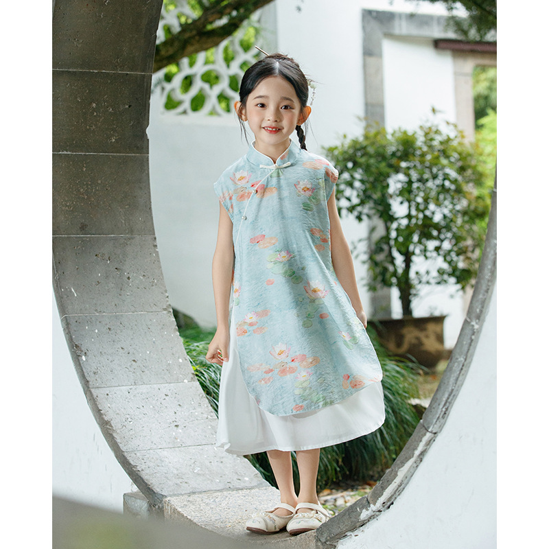 Girls' New Chinese Style dress Green Ao Dai Cheongsam Summer 2024 New Chinese Style Antique Hanfu for Little Girls