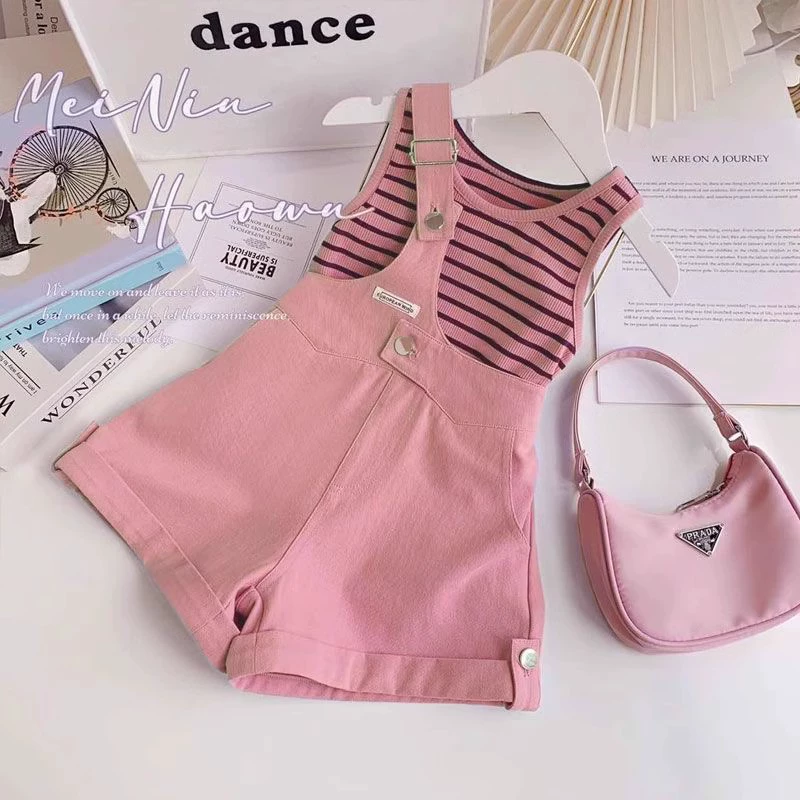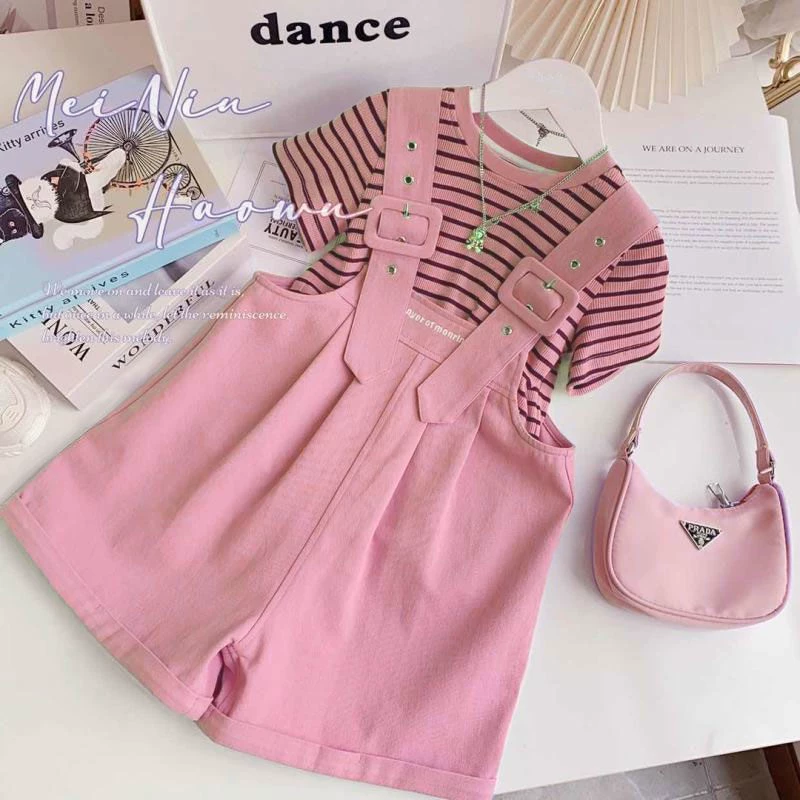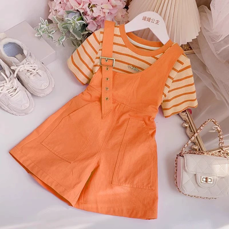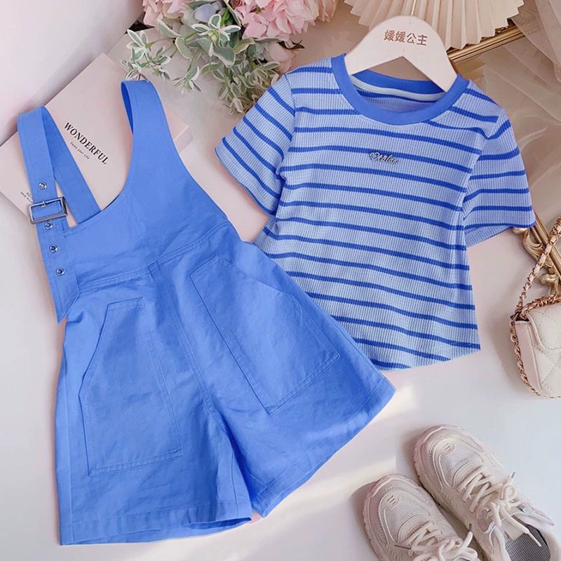 Girls overalls suit summer 2024 new children’s striped short-sleeved medium-sized children’s fashionable and fashionable two-piece set