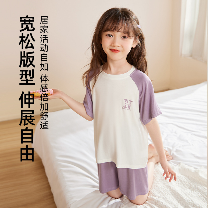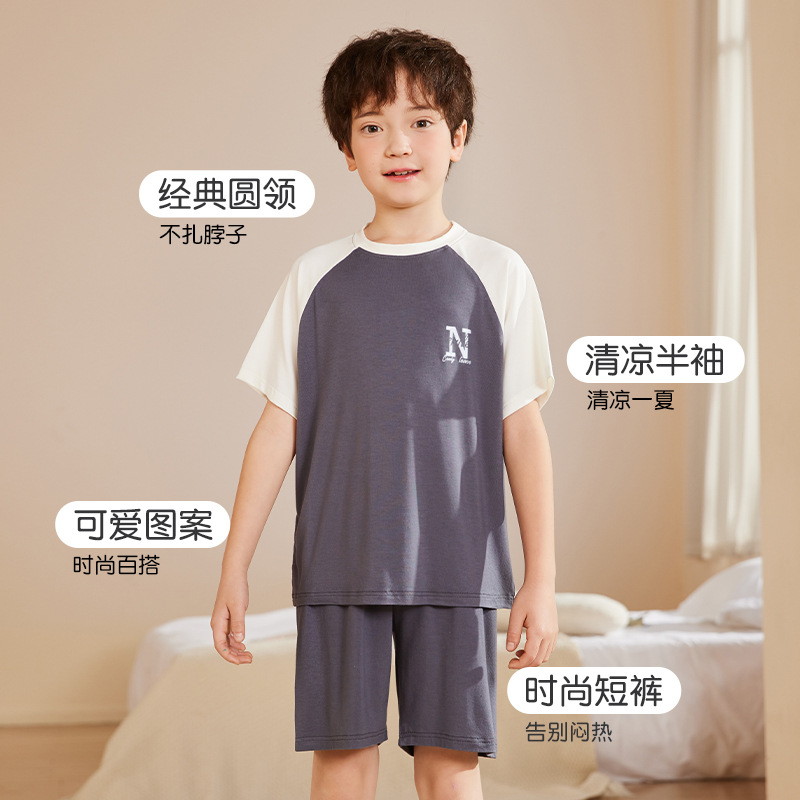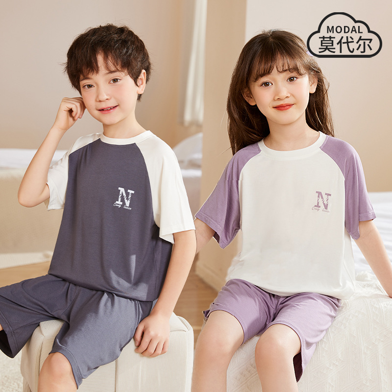 Girls Pajamas Summer New Cute N Letter Thin Short Sleeve Modal Suit for Boys and Girls Summer Air-conditioning Suit