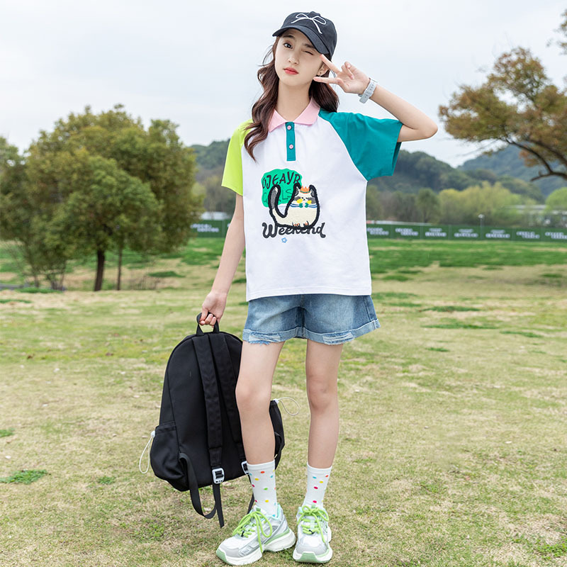 Girls Polo Shirt Short-sleeved T-shirt Summer 2024 New Loose Leck Children’s Wear Western Style Girl Cartoon Children’s Top
