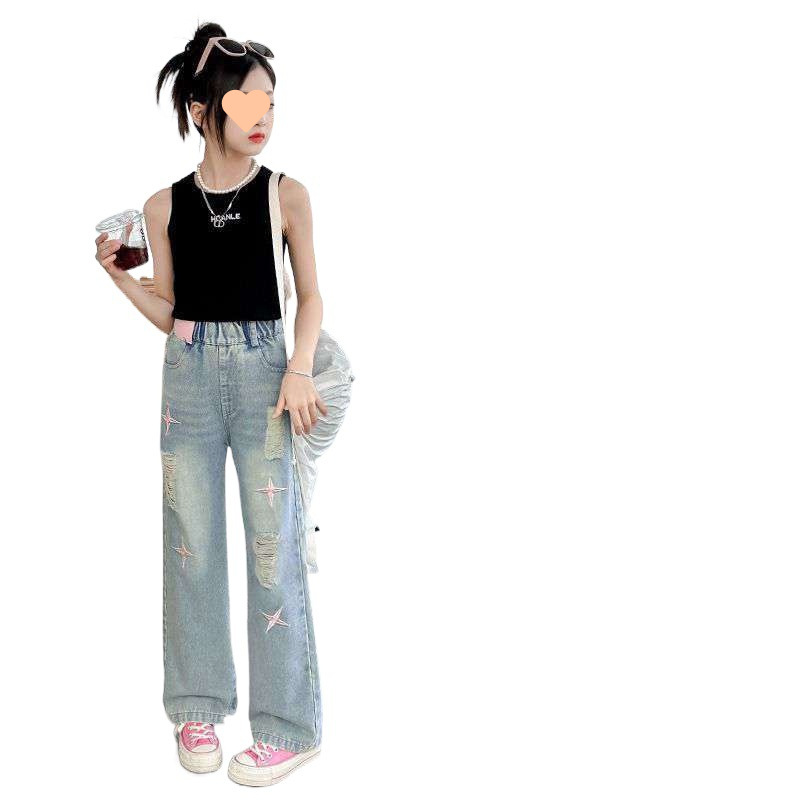 | nameOriginal | Girls' Ripped Jeans 2024 Middle and Big Kids Summer New Internet Celebrity Girls Retro Loose Thin Children |