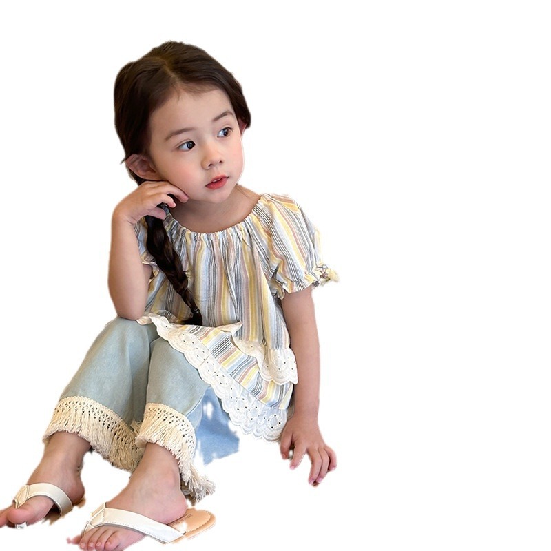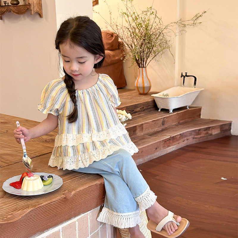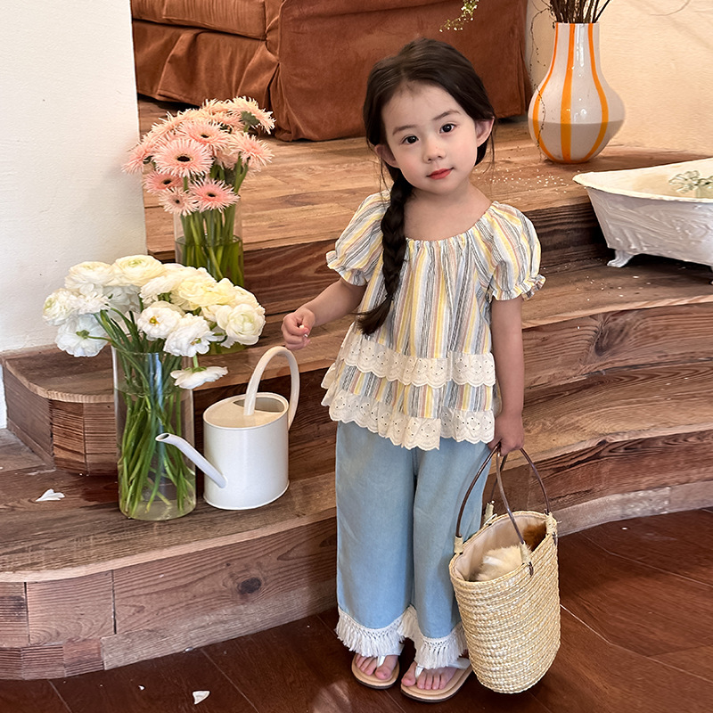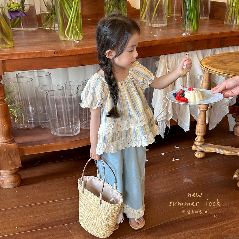 | nameOriginal | Girls Short Sleeve Doll Shirt Color Striped Shirt 2024 Summer New Children's Puff Sleeve Lace Top |