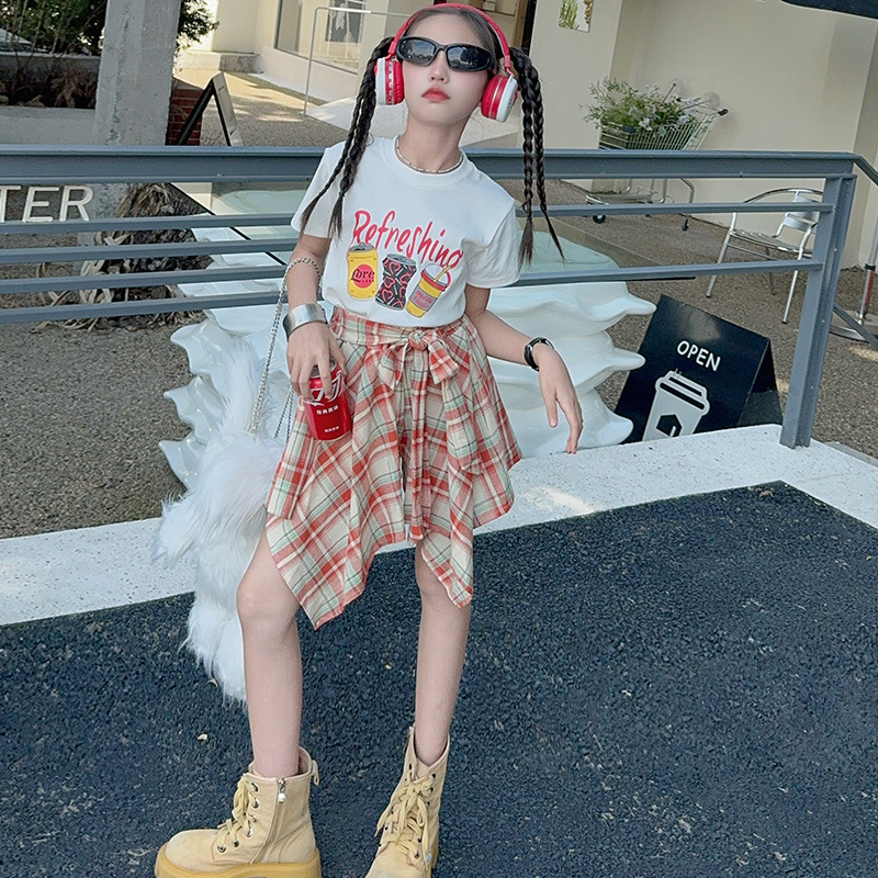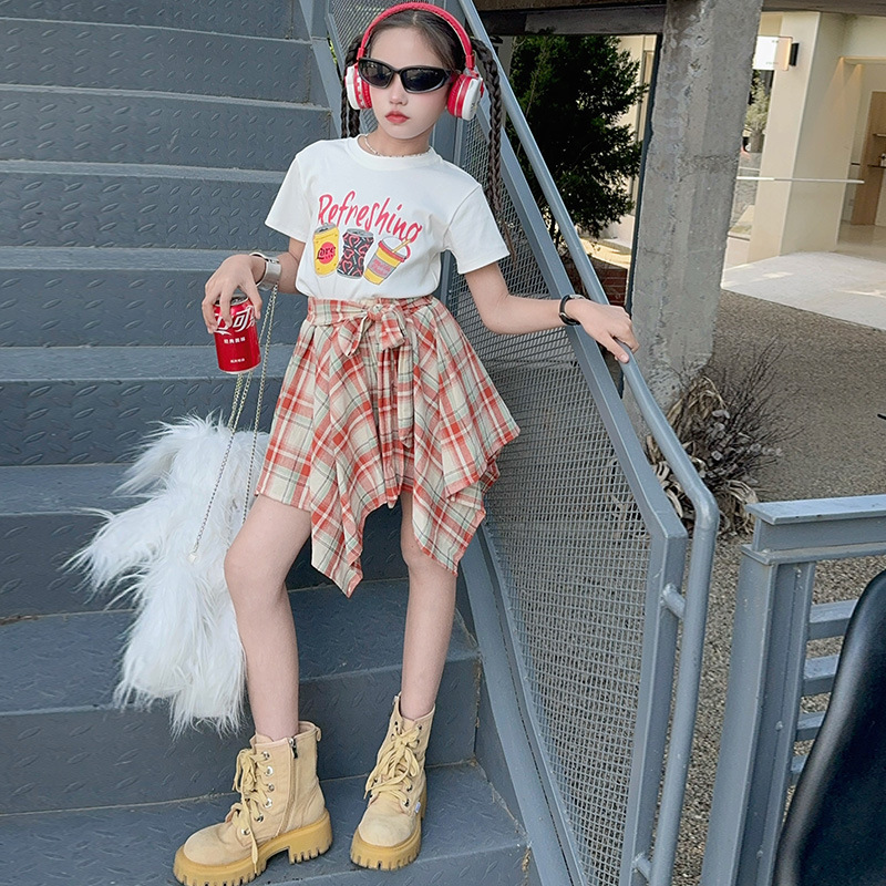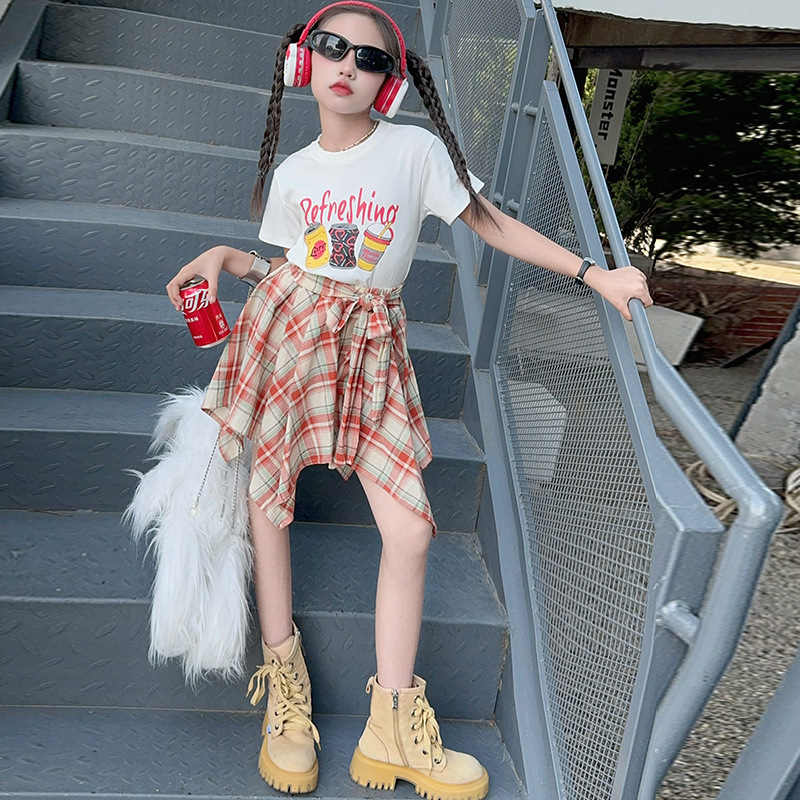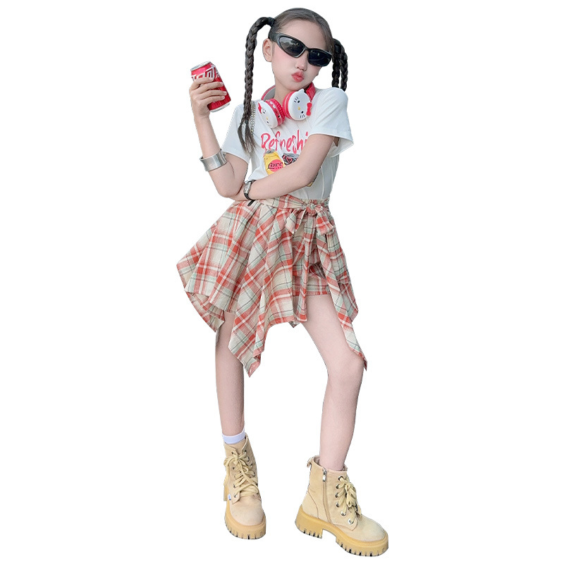 | nameOriginal | Girls' Short-sleeved Short Skirt suit 2024 New Arrival Printed Short-sleeved Irregular Plaid Skirt Trendy Dancing Clothes |