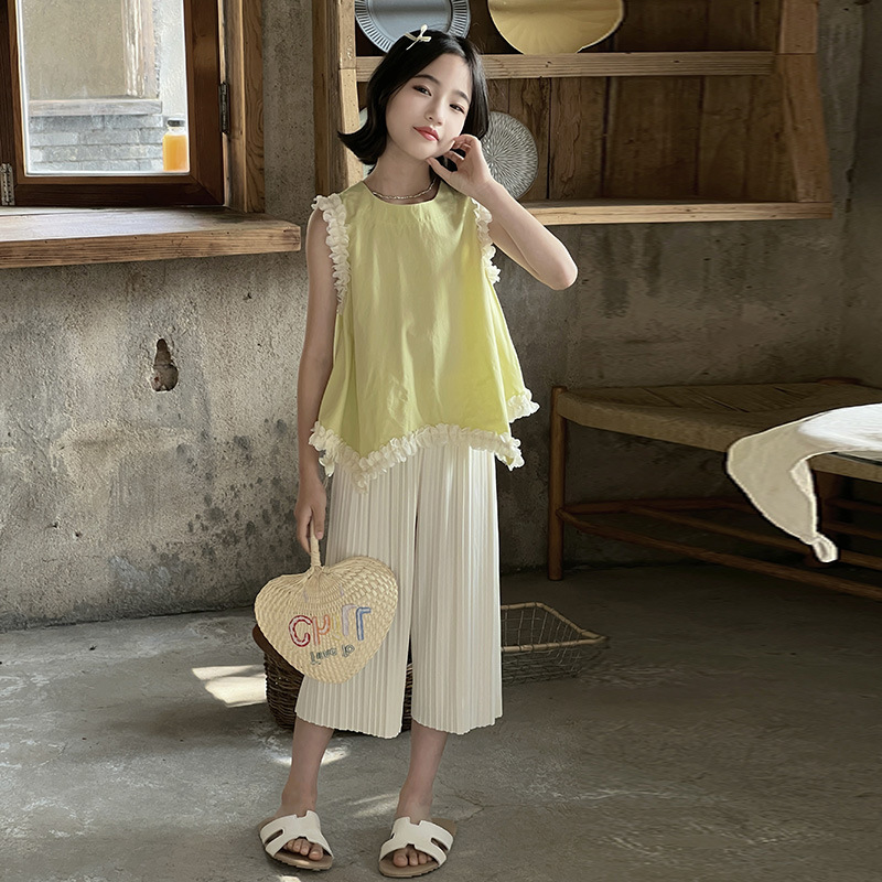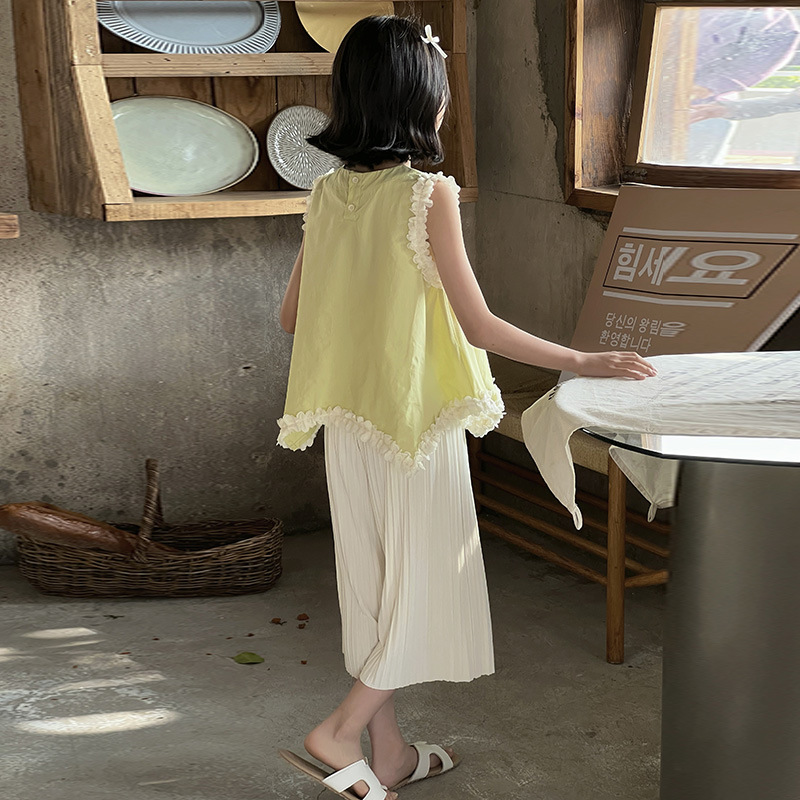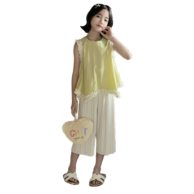 | nameOriginal | Girls' Sleeveless Capri Pants suit 2024 New Children's Mori Lace Vest Cool Summer Ice Silk Two-piece Set |