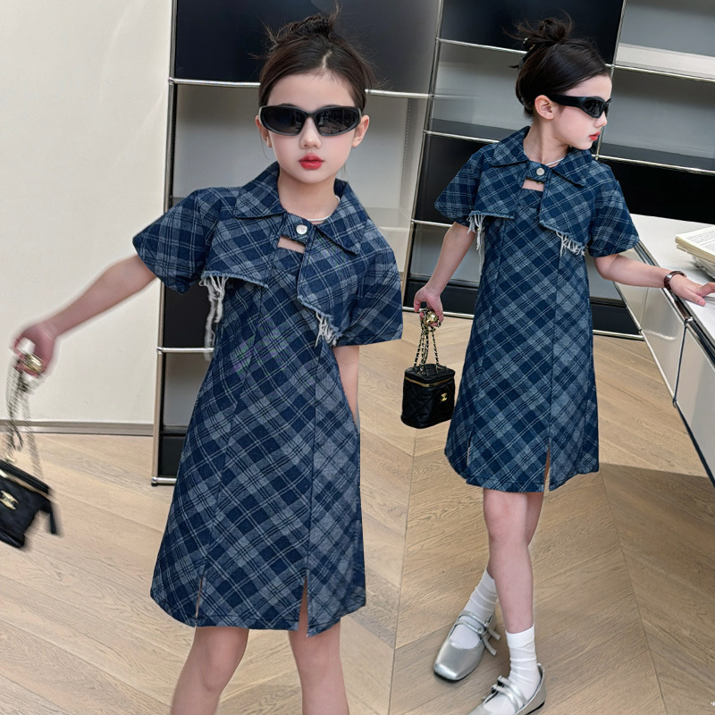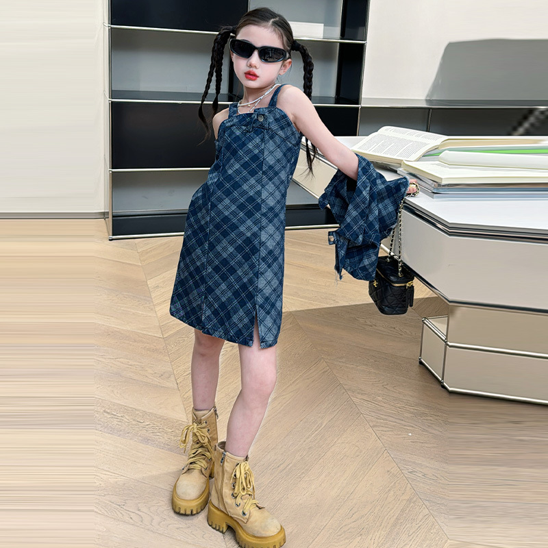 | nameOriginal | Girls' Slip Skirt suit 2024 Summer New Style Middle and Large Children's Denim Split A- Line Skirt Short-Sleeved Shawl Trendy |