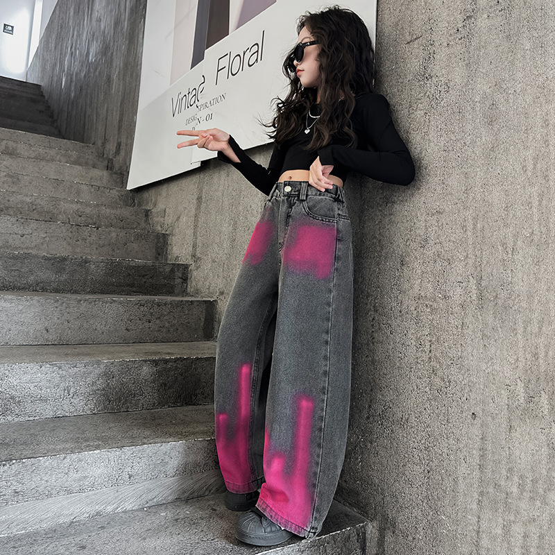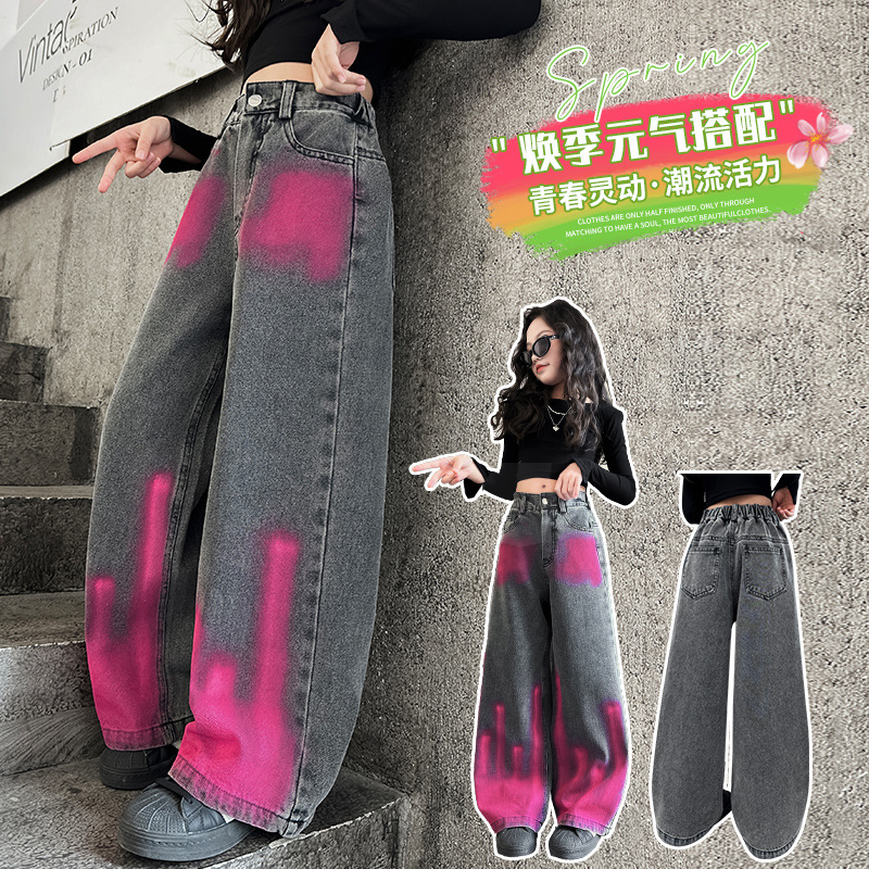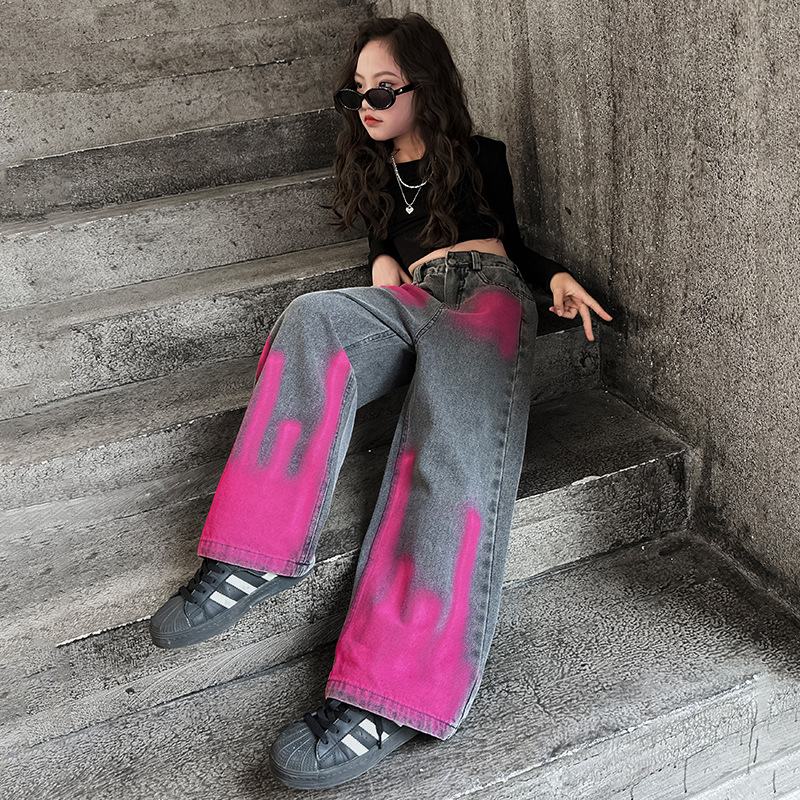 | nameOriginal | Girls Spring New American Graffiti Jeans Personalized Street Jazz Dance Show Middle and Big Kids Casual Wide Leg Pants |