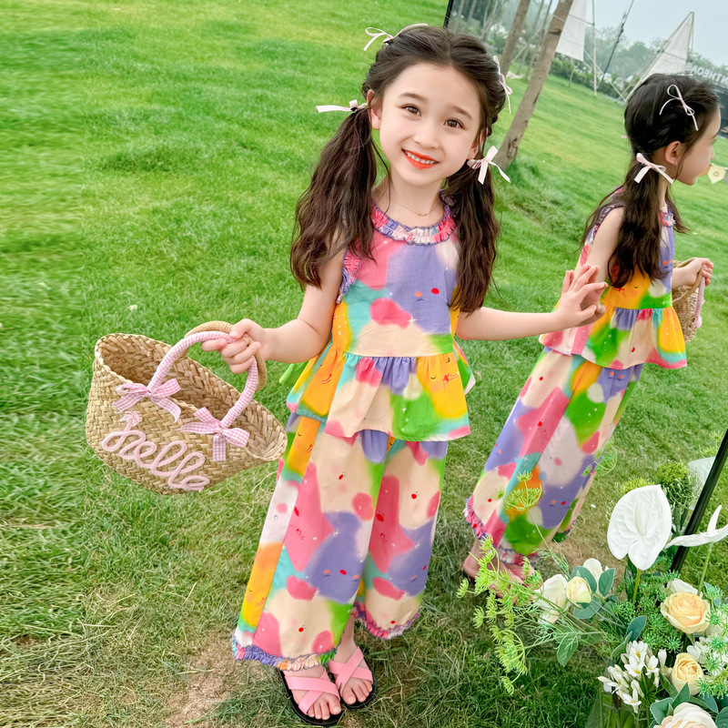 Girls’ Star Tie-Dye suit Summer 2024 New Children’s Stylish Fashionable Wide Leg Pants Baby Girls’ Summer Casual