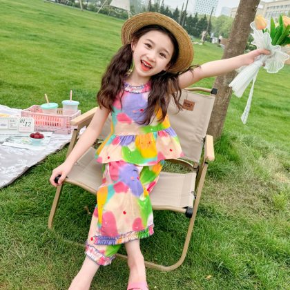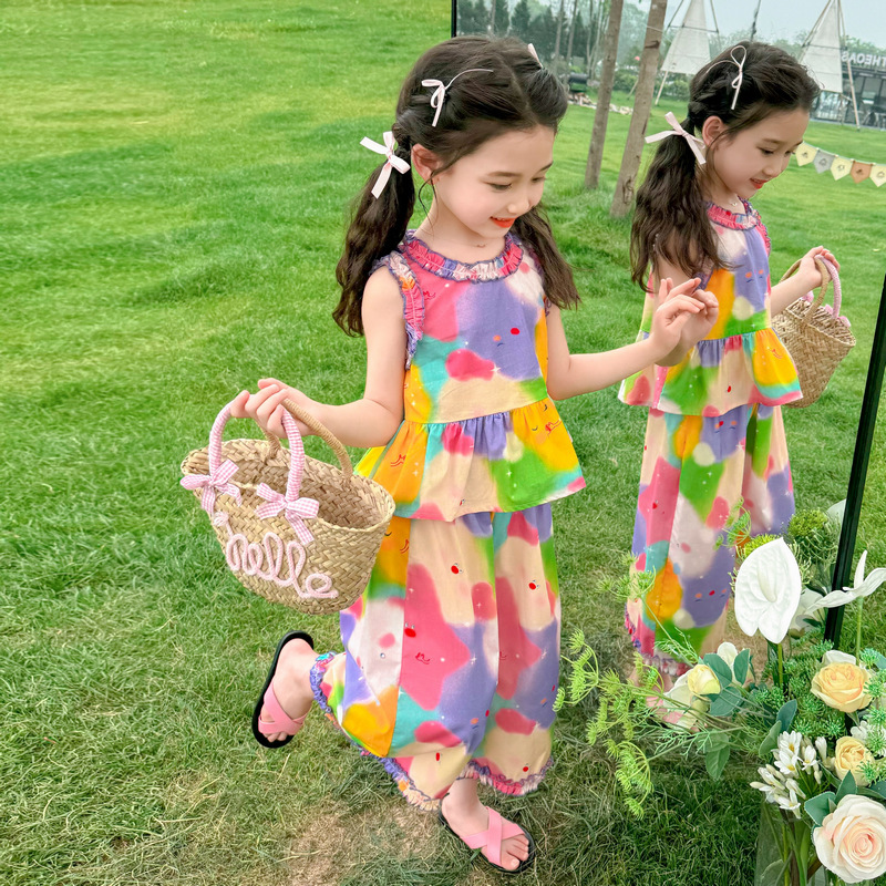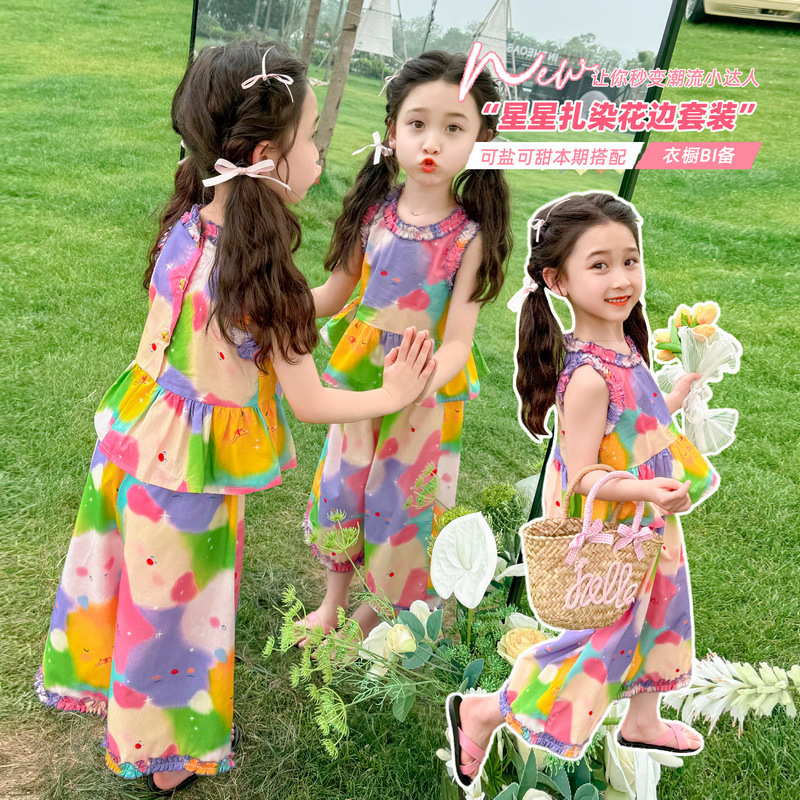 Girls’ Star Tie-Dye suit Summer 2024 New Children’s Stylish Fashionable Wide Leg Pants Baby Girls’ Summer Casual