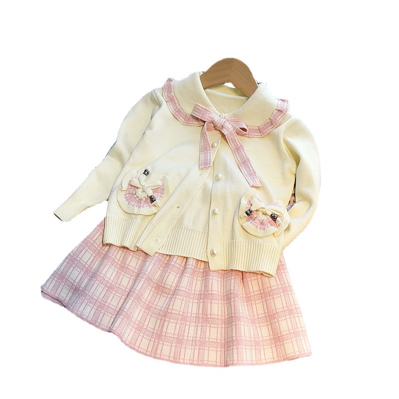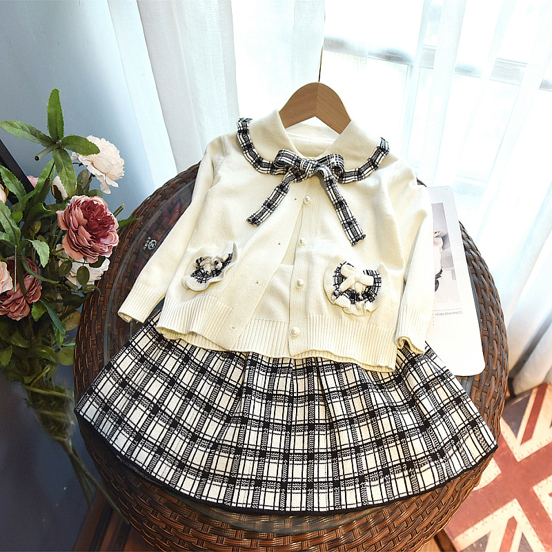 | nameOriginal | Girls' suit 2023 new children's spring clothes Western style Chanel style knitted plaid pleated skirt two-piece set |