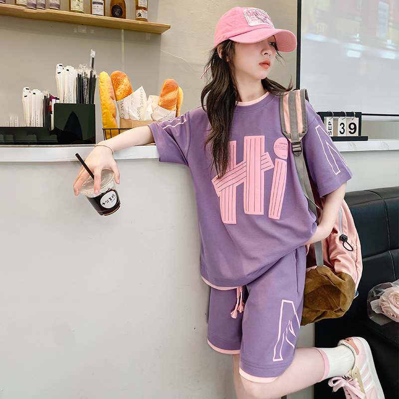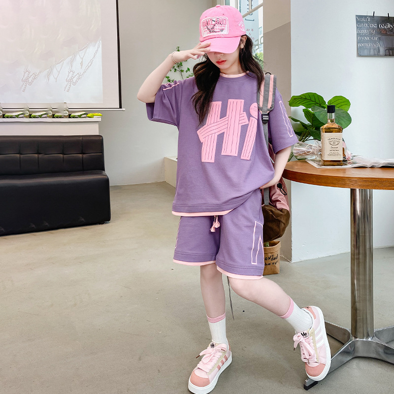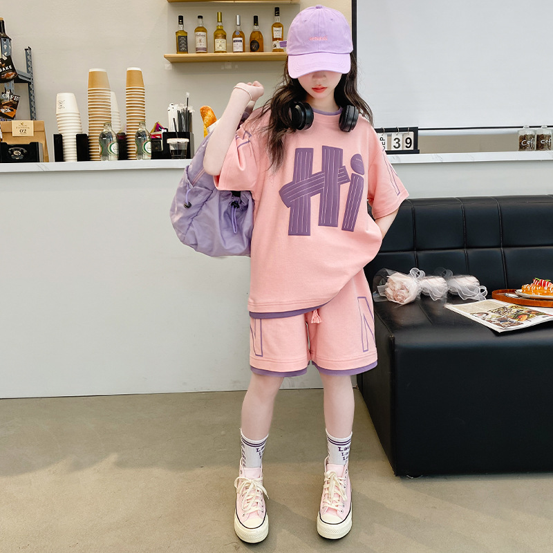| nameOriginal | Girls' suit 2024 New Summer Western Style Middle and Big Children's Fashionable Thin Letter Short-sleeved Shorts Casual Two-piece Set |