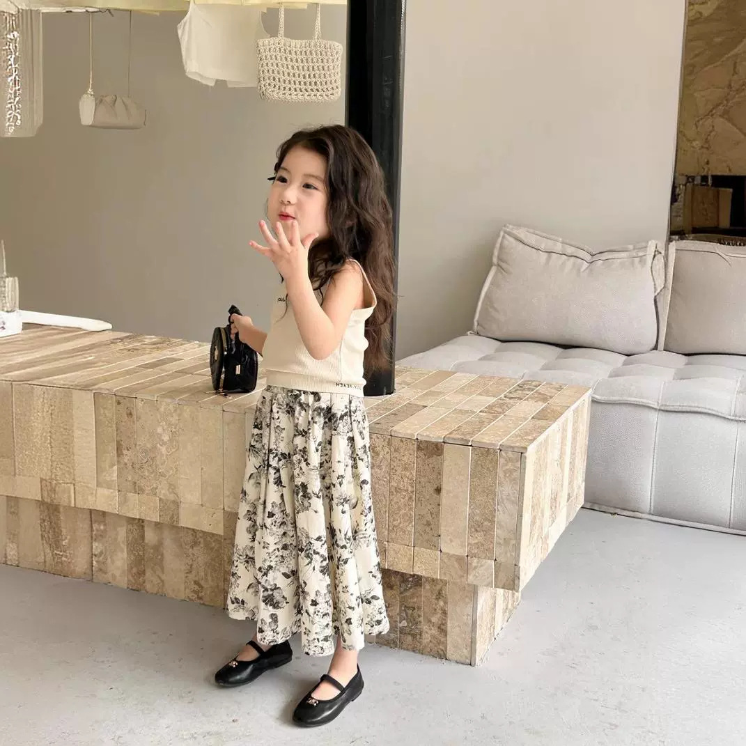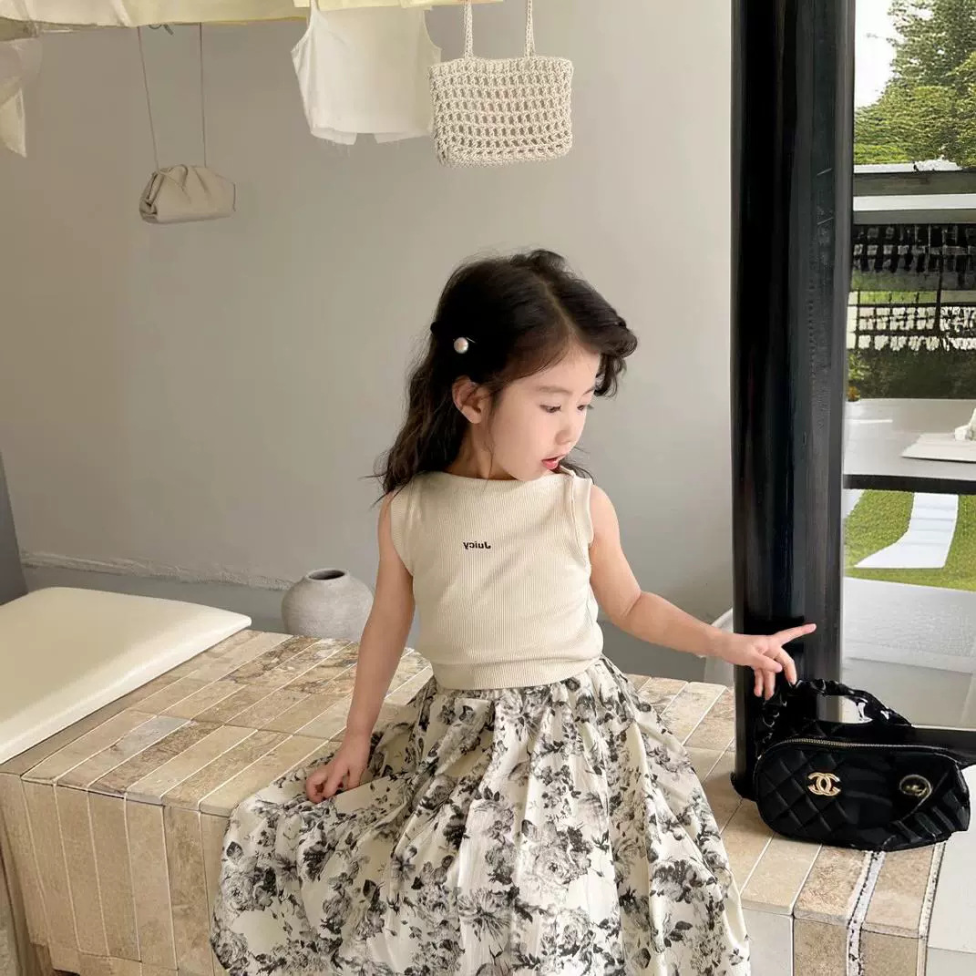 Girls suit elastic letter vest and flower skirt 2024 summer new foreign trade children’s clothing factory supply