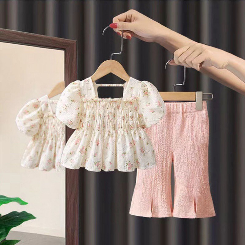 | nameOriginal | Girls' suit Summer 2024 New Baby Western Style Floral Short-sleeved Top Flared Pants Internet Popular Fresh Two-piece Set |