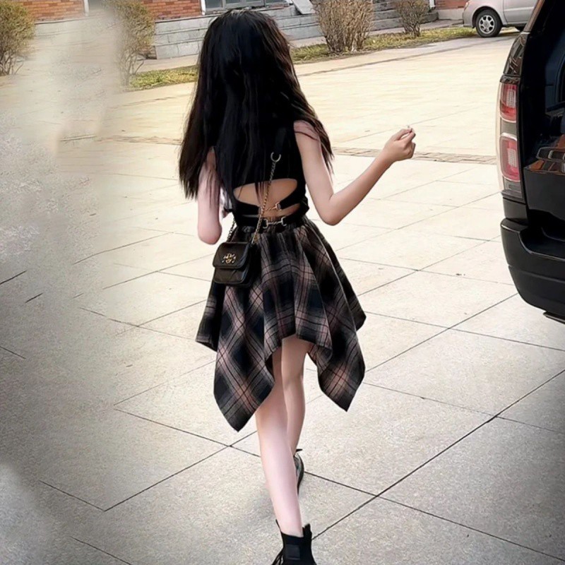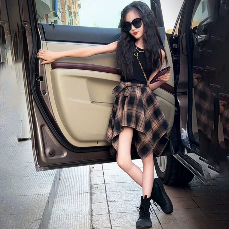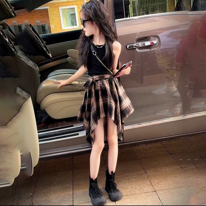 | nameOriginal | Girls' Summer 2024 New Style Western Style Plaid Fake Two-Piece Bust Pants Skirt Vest Top Fragrant Style suit Trendy |