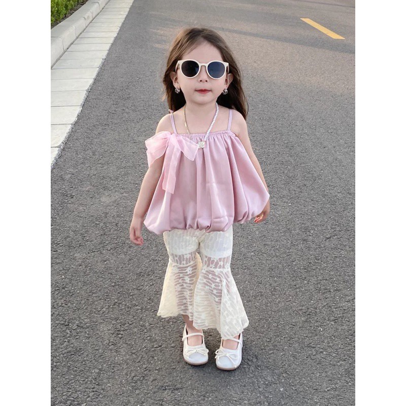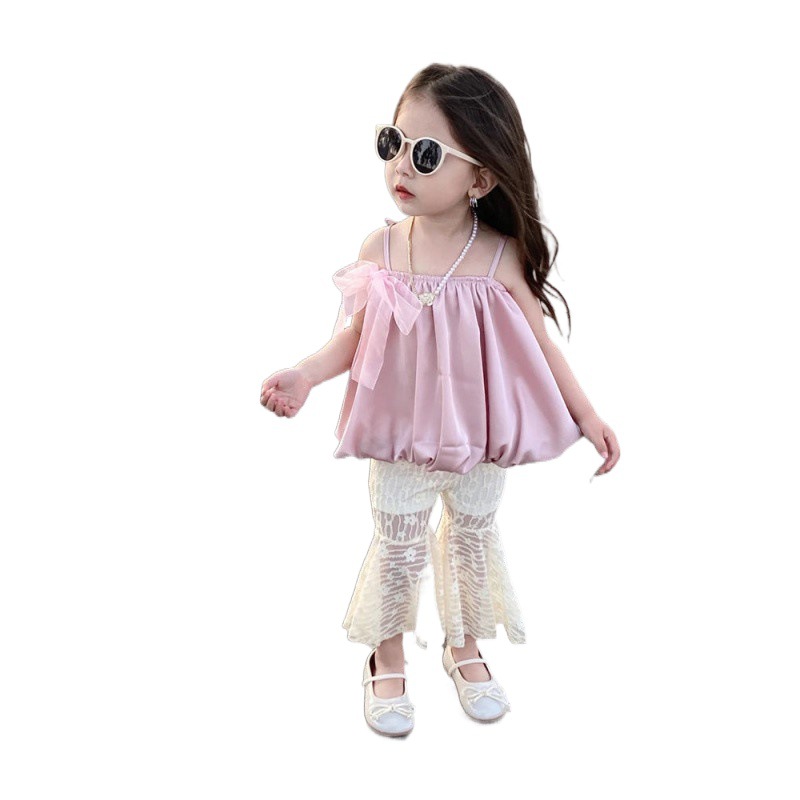 | nameOriginal | Girls' Summer Bow Strap Top 2024 New Korean Style Baby Girl's Western Style Lace Flared Pants Two-piece Set |