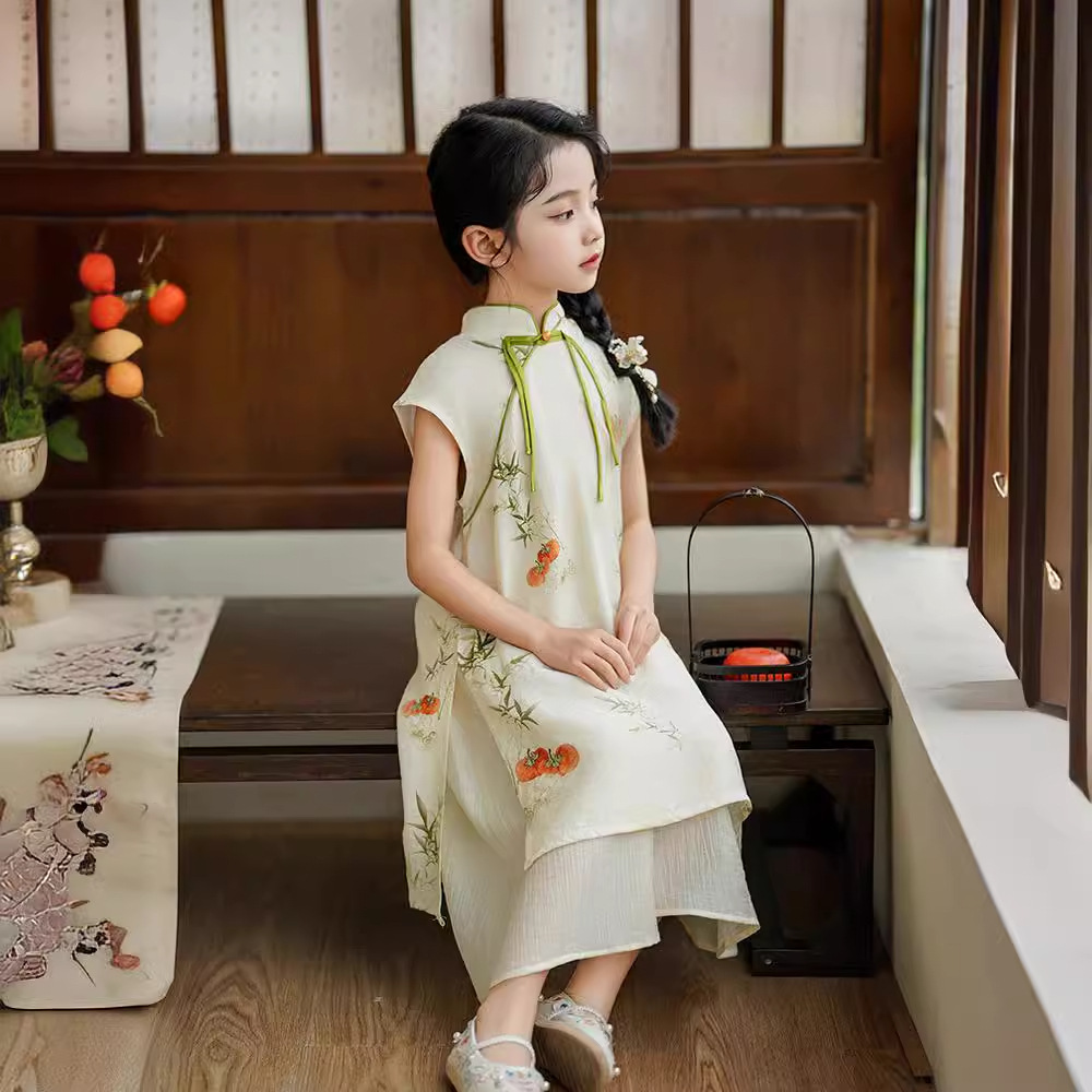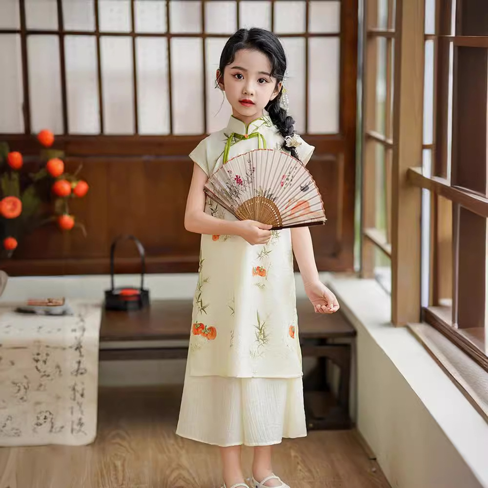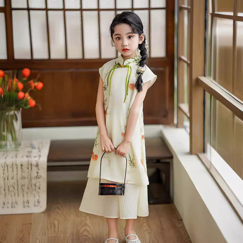 | nameOriginal | Girls Summer dress 2024 New Junior High School Girls Guofeng Persimmon Ruyi Girls Cheongsam Skirt suit |