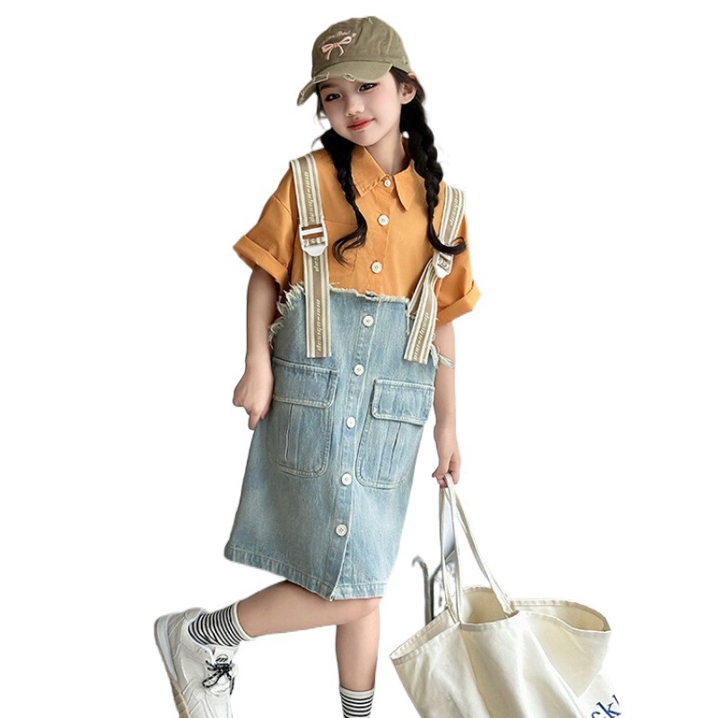 | nameOriginal | Girls' Summer Fake Two-piece Gradient Denim Skirt 2024 New Korean Style Middle and Large Children's Thin Rake Edge Denim Strapband Skirt |