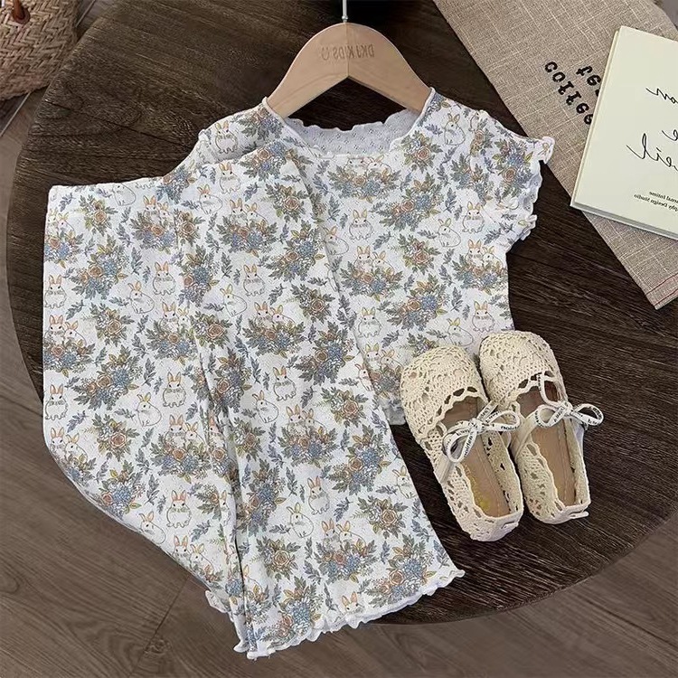 Girls' Summer Home Clothes suit Baby's Western Style Children's Personalized Trendy Korean Style Ear Edge Floral Air-conditioning Clothes Pajamas