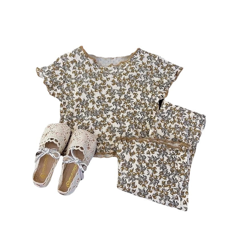 Girls’ Summer Home Clothes suit Baby’s Western Style Children’s Personalized Trendy Korean Style Ear Edge Floral Air-conditioning Clothes Pajamas