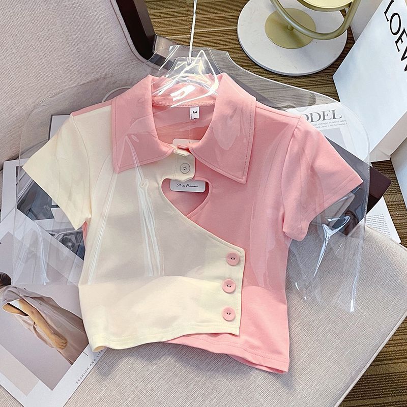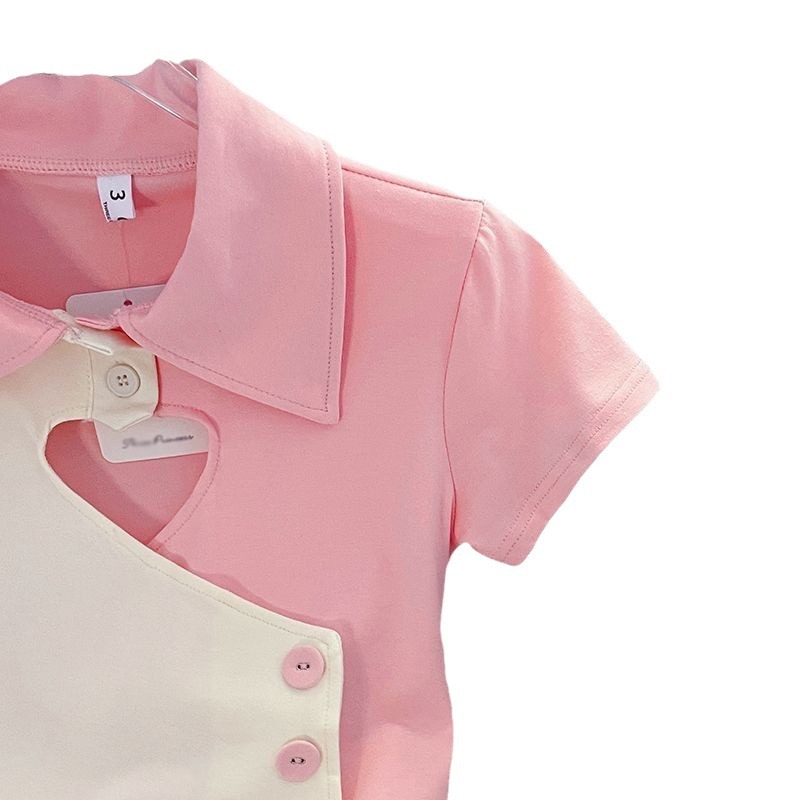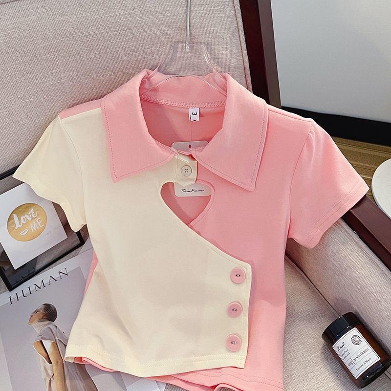 Girls' Summer Short-sleeved T-shirt Contrast Color Hollow-out Love 2024 New Style Color-matching Short POLO Collar Top Trendy