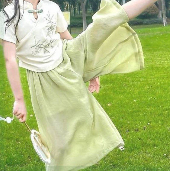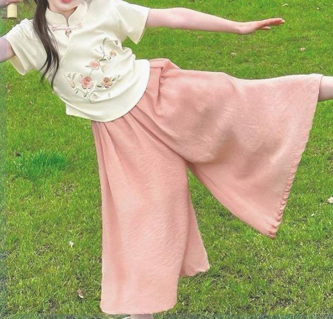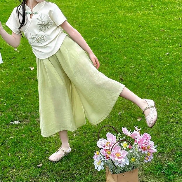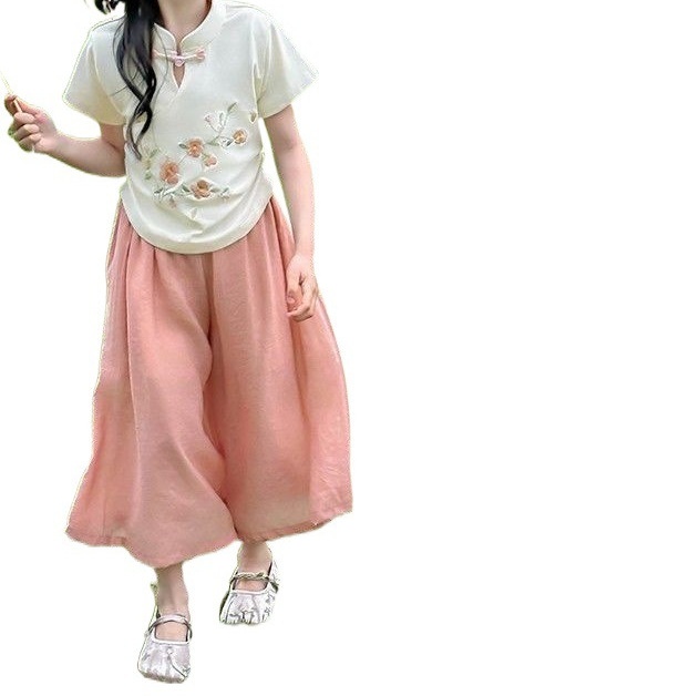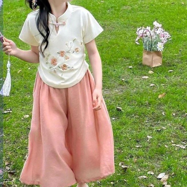 | nameOriginal | Girls' Summer suit 2024 New Children's Chinese-style Super Fairy Fresh Button Short-sleeved Wide-leg Pants Two-piece Set |