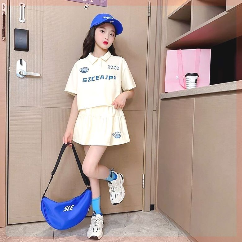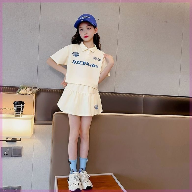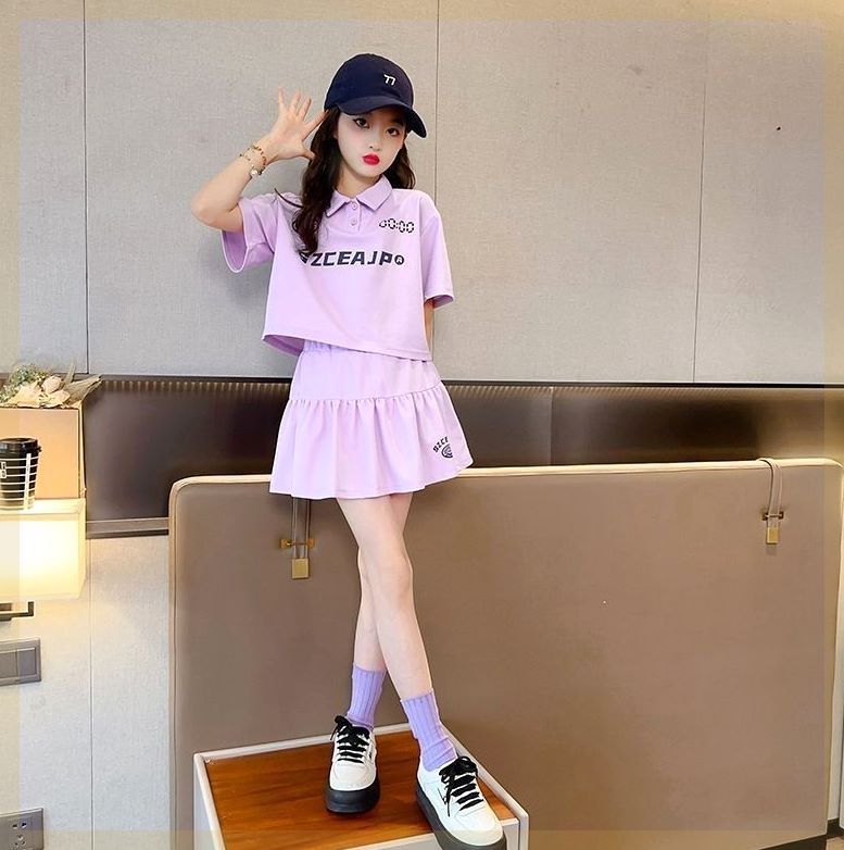 Girls' Summer suit Polo Shirt New Cyber Popular Short-sleeved Slimming Skirt Two-piece Set for Big Kids Casual Sports