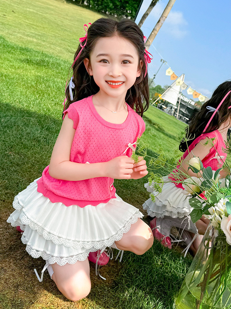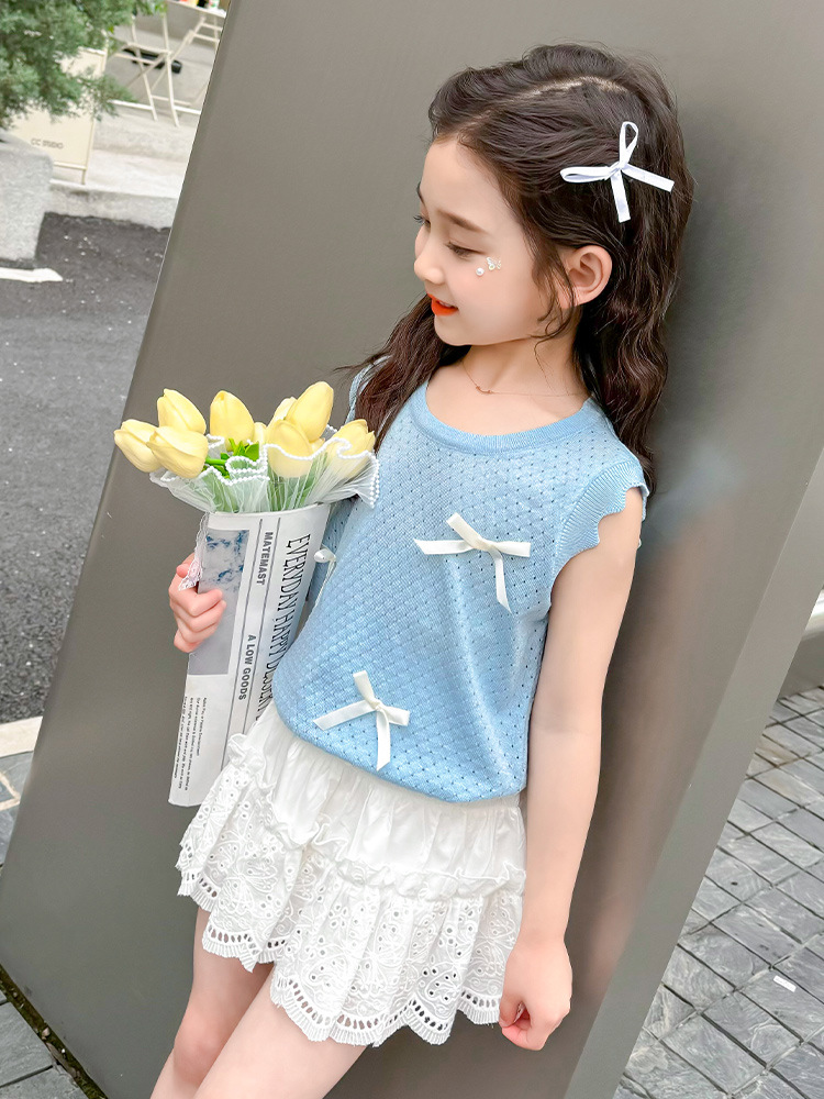 Girls' Summer Thin T-Shirt Children's Ice Silk Hollow Knitted Vest Summer Princess Baby Western-style Children's Top