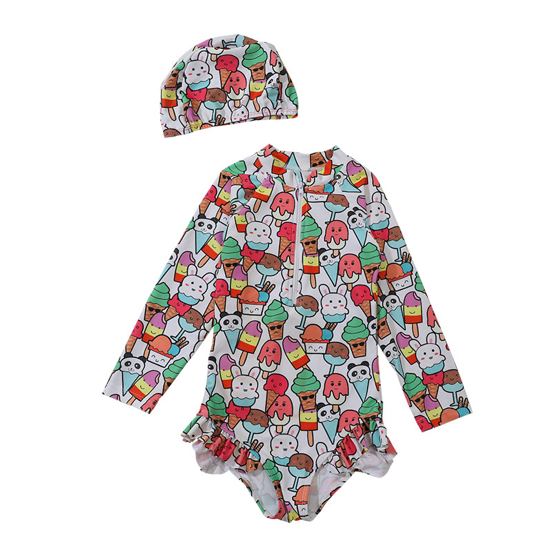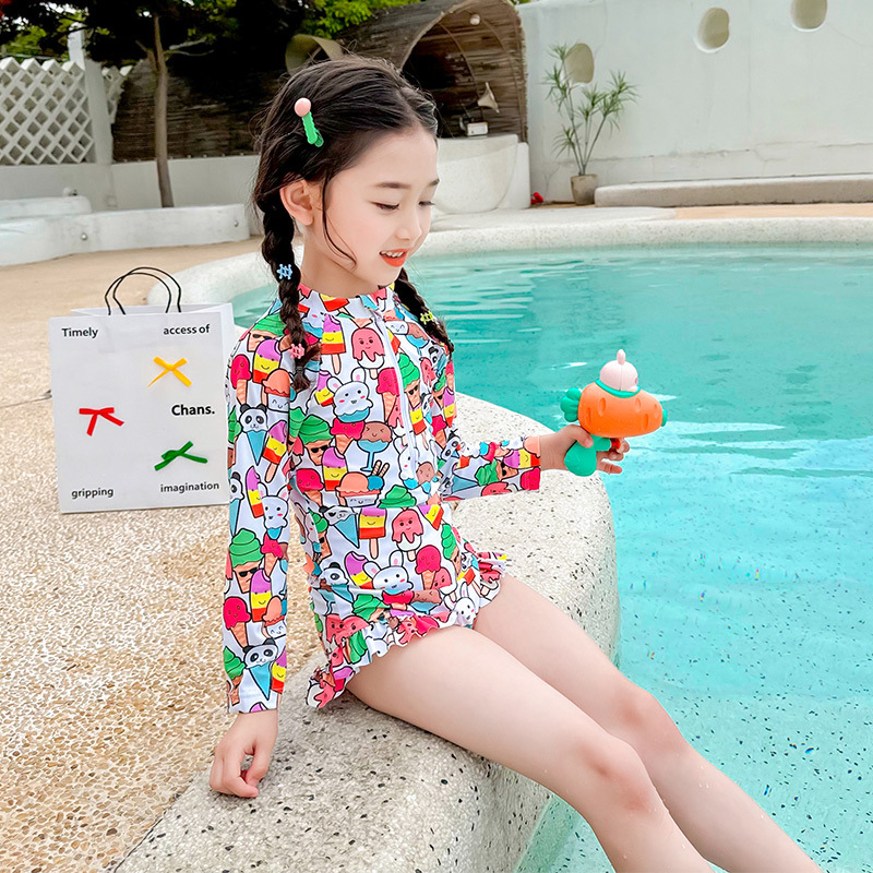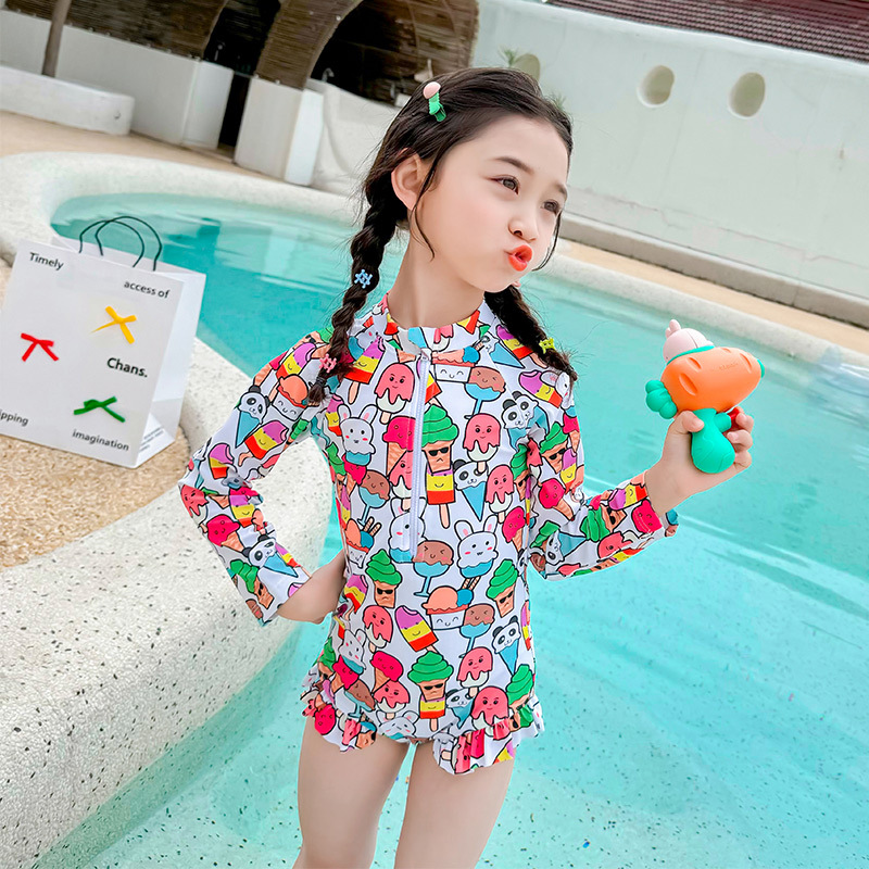 Girls' Swimwear Small and Medium-sized Children's Cartoon Foreign Style Princess Long-sleeved Cute one-piece Swimsuit 2024 New Summer Swimwear