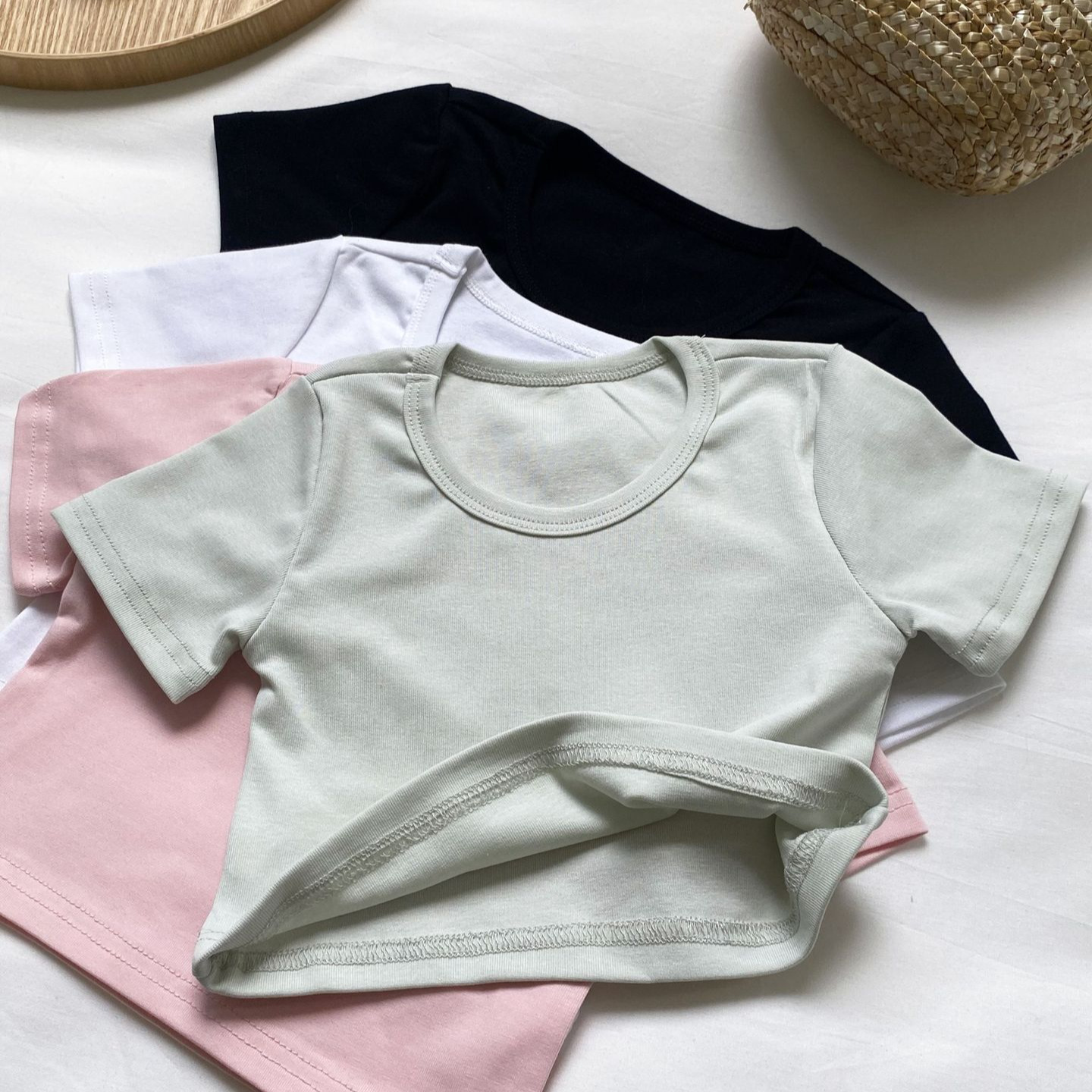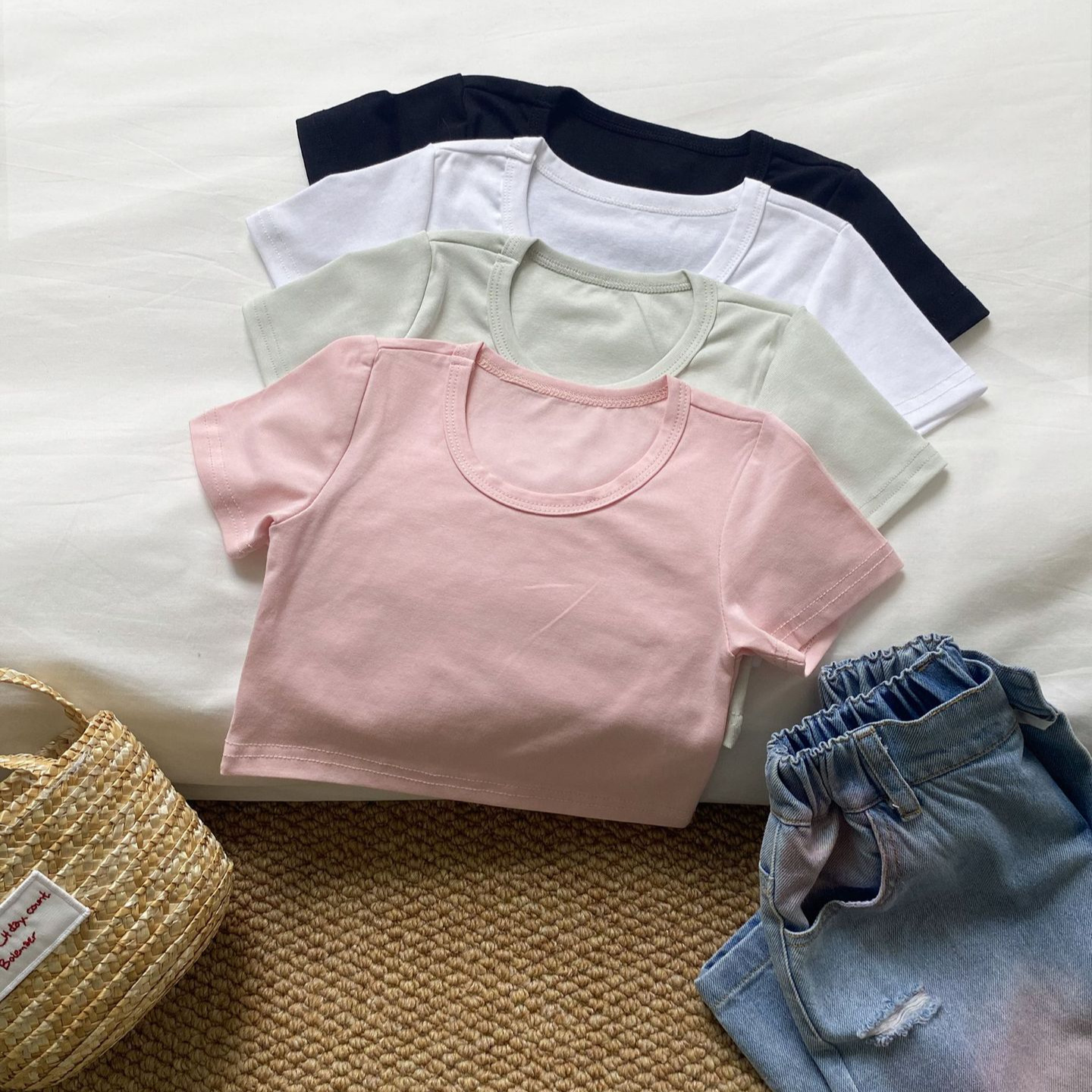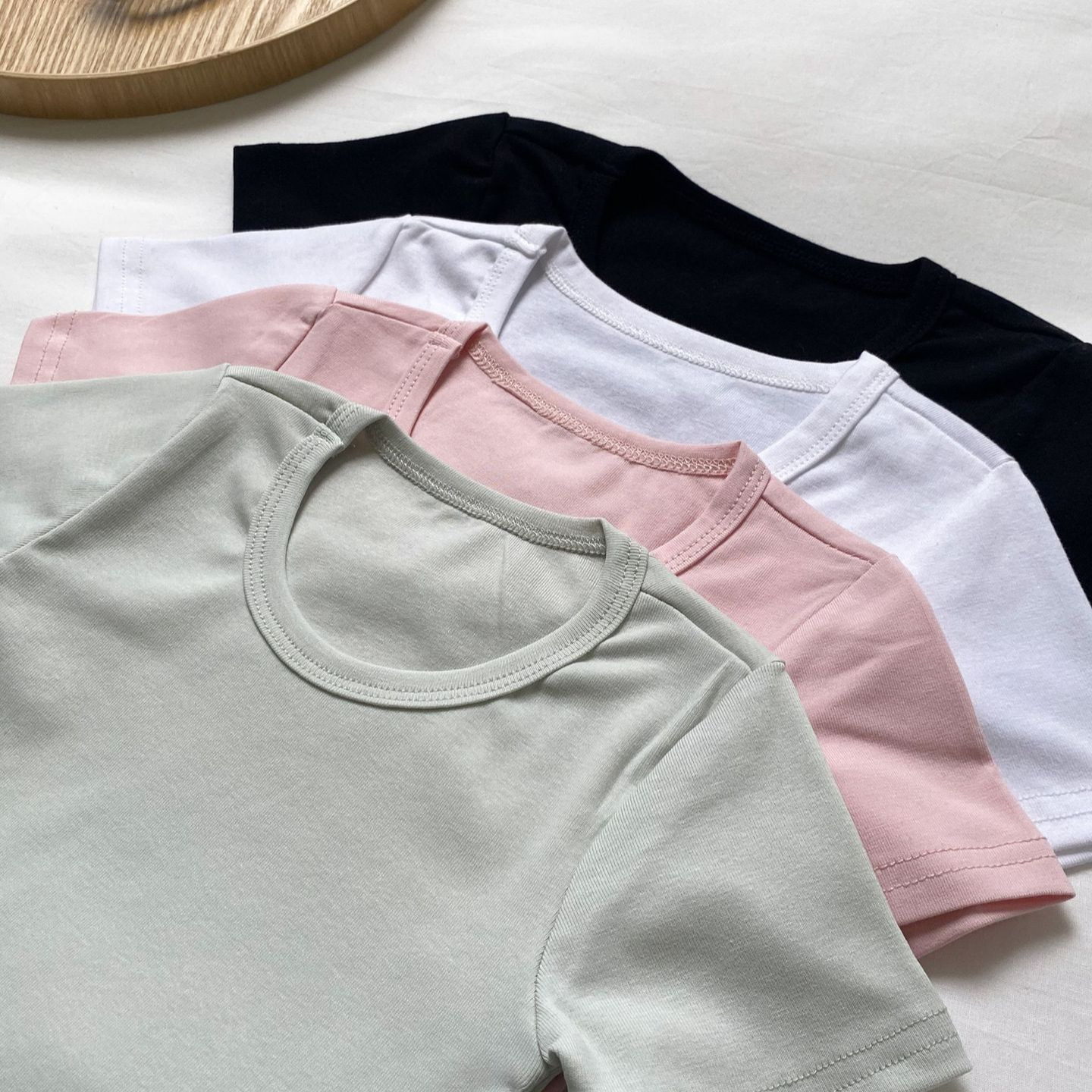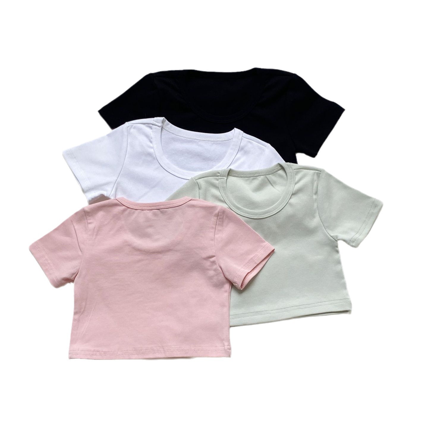 | nameOriginal | Girls' T-shirt 2024 Summer New Slim-fit Sweet and Hot Inner Short Shoulder Cotton Korean Candy Color U-neck Top |