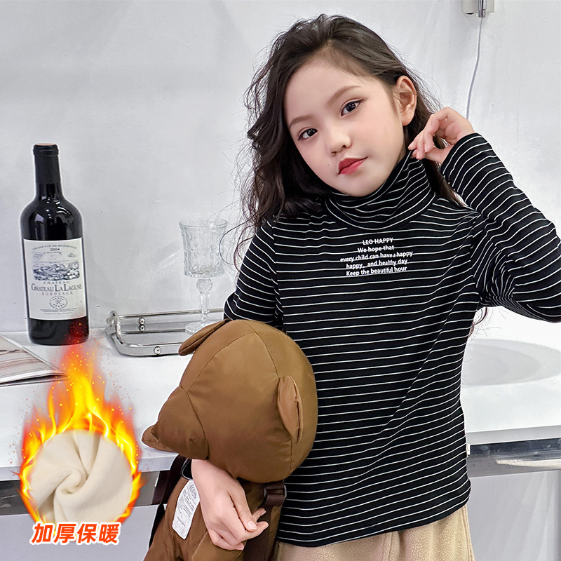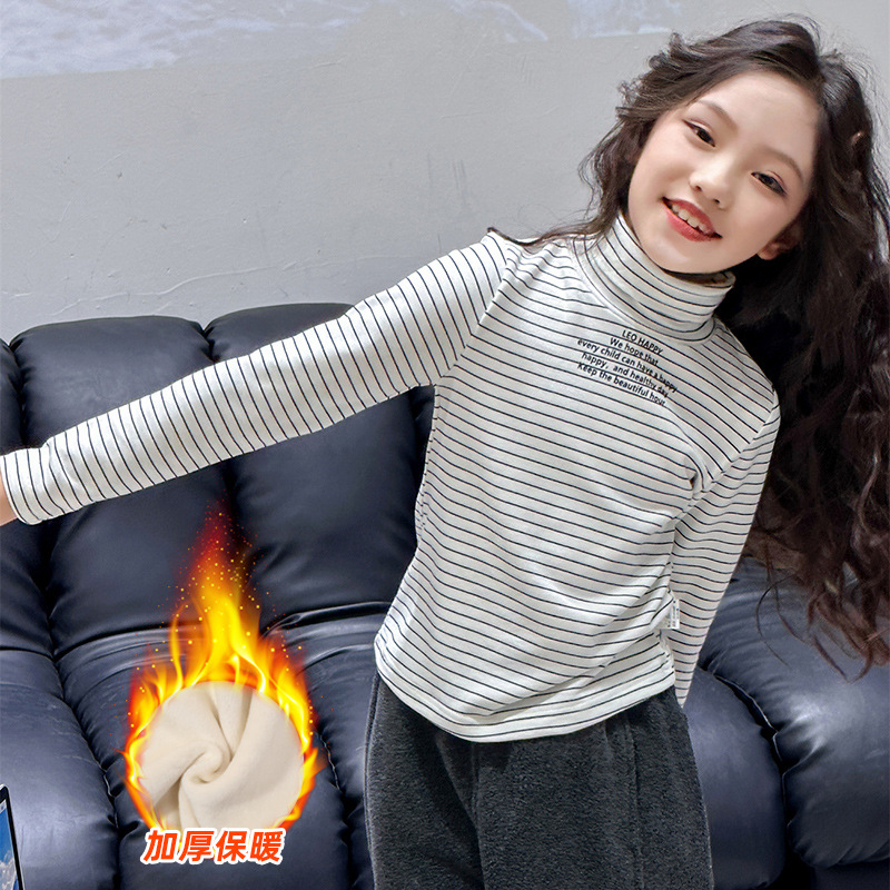 Girls' turtleneck long sleeve fleece-lined bottoming shirt 2023 Winter new fashion striped top middle and big Children winter sweater