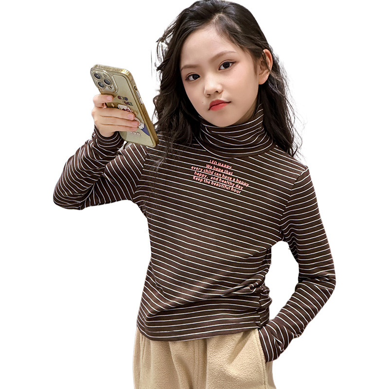 Girls’ turtleneck long sleeve fleece-lined bottoming shirt 2023 Winter new fashion striped top middle and big Children winter sweater