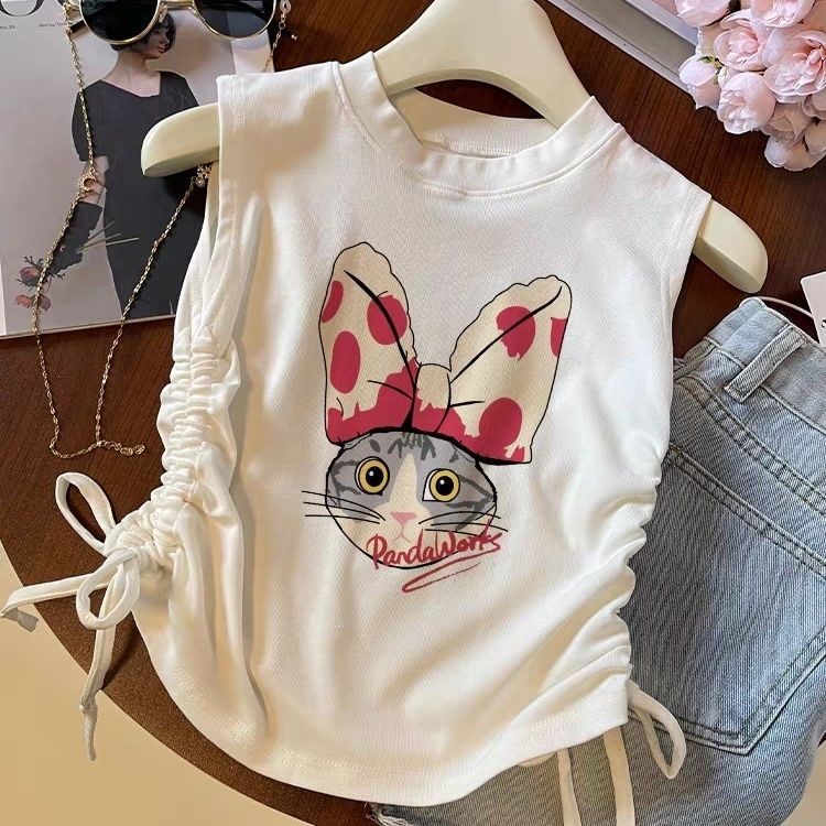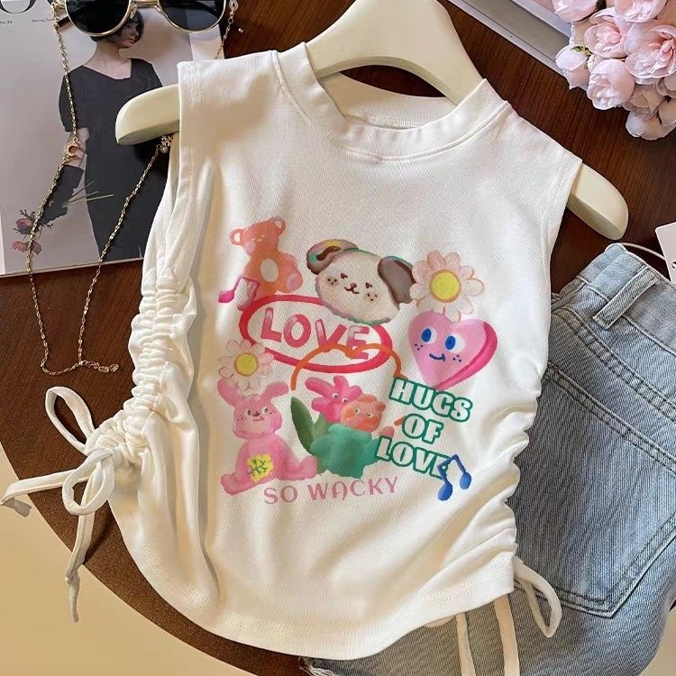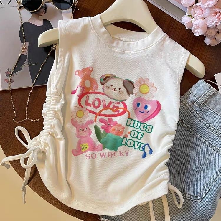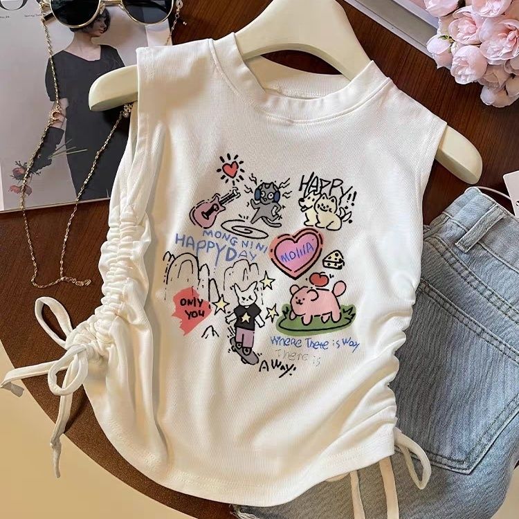Girls' Vest Summer New Children's Drawstring Slim-fit Cartoon Printed Sleeveless T-shirt Pullover Top 0208A042