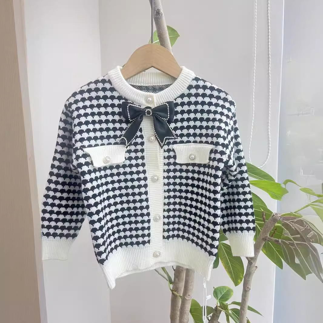 Girls’ Warm Knitted Coat 2024 Autumn and Winter New Style All-Match Chanel Style Bow Pullover