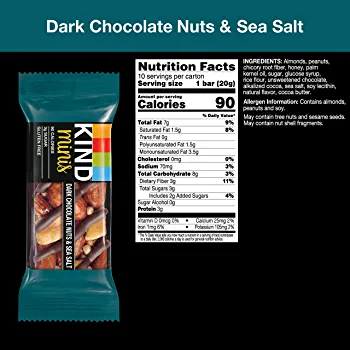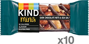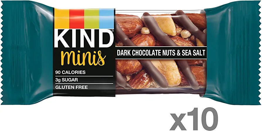 | nameOriginal | KIND Minis, Dark Chocolate Nuts & Sea Salt, Healthy Snacks, Gluten Free, Low Calorie Snacks, Low Sugar, 10 Count |