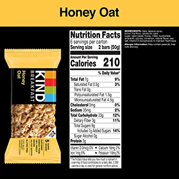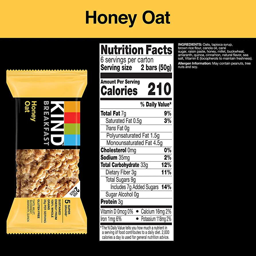 KIND Breakfast Honey Oat bars are a wholesome, healthy snack made with 100% whole grains for sustained energy. KIND Honey Oat breakfast bars are made with five super grains—oats, buckwheat, millet, amaranth and quinoa—and baked with a touch of honey for a chewy, soft baked addition to your breakfast. These KIND bars come in individually wrapped two bar packs that are perfect for convenient, on-the-go gluten free snacks. Each two bar pack has at least one full serving of whole grains. KIND Breakfast bars help provide sustained energy whether you need a nutritious snack for your lunchbox or nutrition bars to grab on your way out the door. Made with quality, wholesome ingredients, these gluten free breakfast bars contain 28 grams of whole grains per serving and 0 grams of trans fat. These healthy snacks are also dairy free and made without genetically engineered ingredients.