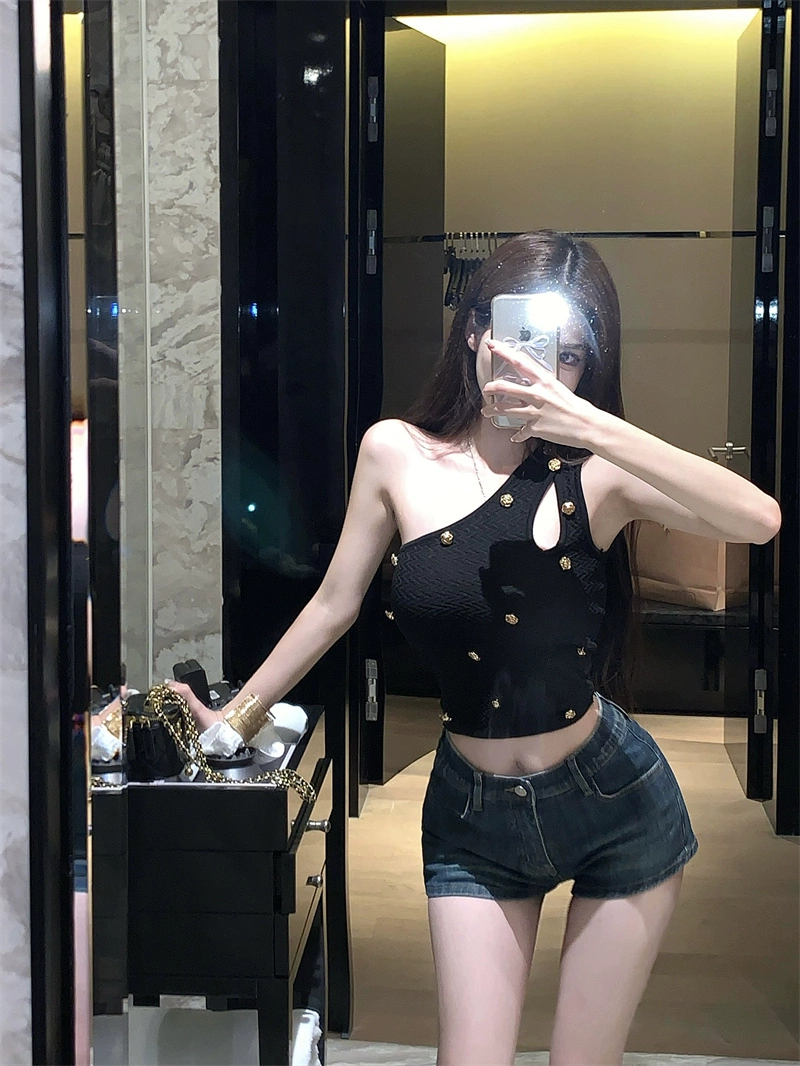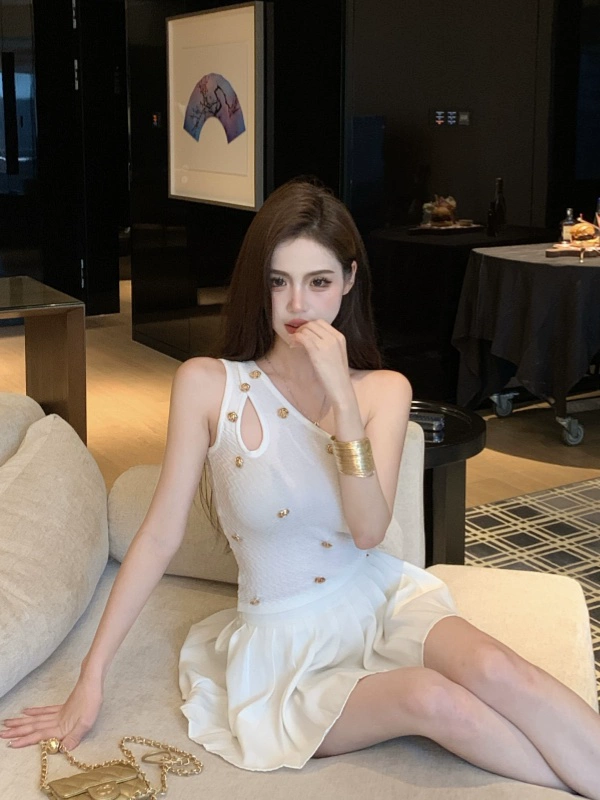 Gold buckle sloping shoulder slim fit hollow sleeveless camisole