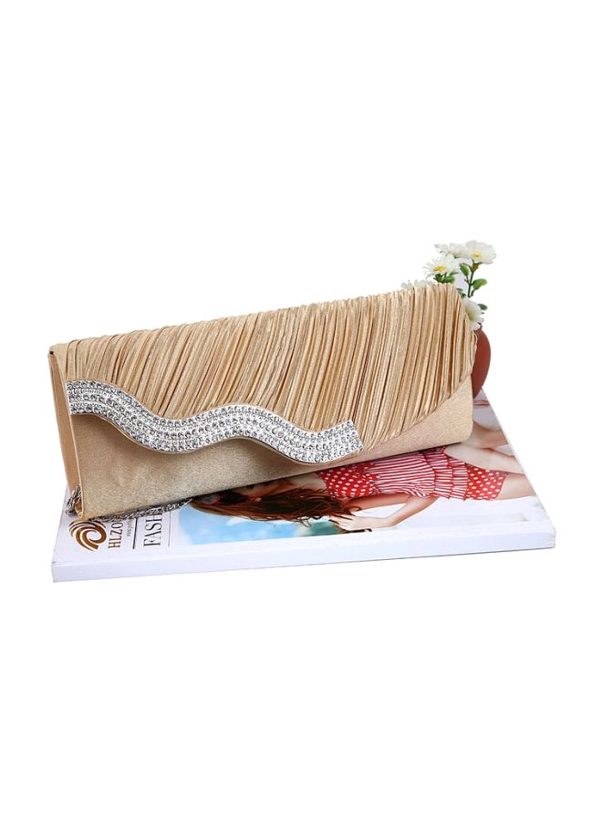 The Crystal Studded Clutch Gold is a stunning accessory that will add a touch of glamour to any outfit. This clutch is made of high-quality materials and features a beautiful gold finish that will catch the eye of anyone who sees it. The clutch is adorned with sparkling crystals that are carefully placed to create a dazzling effect. The interior of the clutch is spacious enough to hold all your essentials, including your phone, keys, and makeup. The clutch also comes with a detachable chain strap, allowing you to wear it as a shoulder bag or carry it as a clutch. Whether you’re attending a formal event or a night out with friends, the Crystal Studded Clutch Gold is the perfect accessory to complete your look.